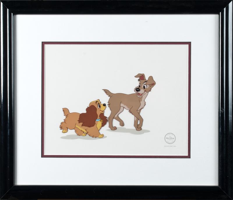 Depicting Lady and the Tramp with COA. Nicely framed and matted, 10.5" H x 13.5" W (sight).