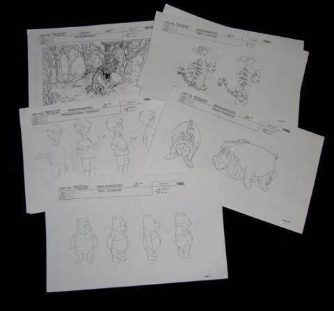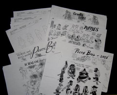Walt Disney Animated Character Turnarounds - Production copies of multiple angels of animated characters, called "turnarounds". Includes; "Winnie The Pooh and The Family Tree" with every character and location background, 101 Dalmatians characters - Cruella, Jasper and Horace, Dot, Pongo and the puppies. A huge package of many major characters from many Disney titles. Includes many packages and pages. In Walt Disney Archive Envelopes.