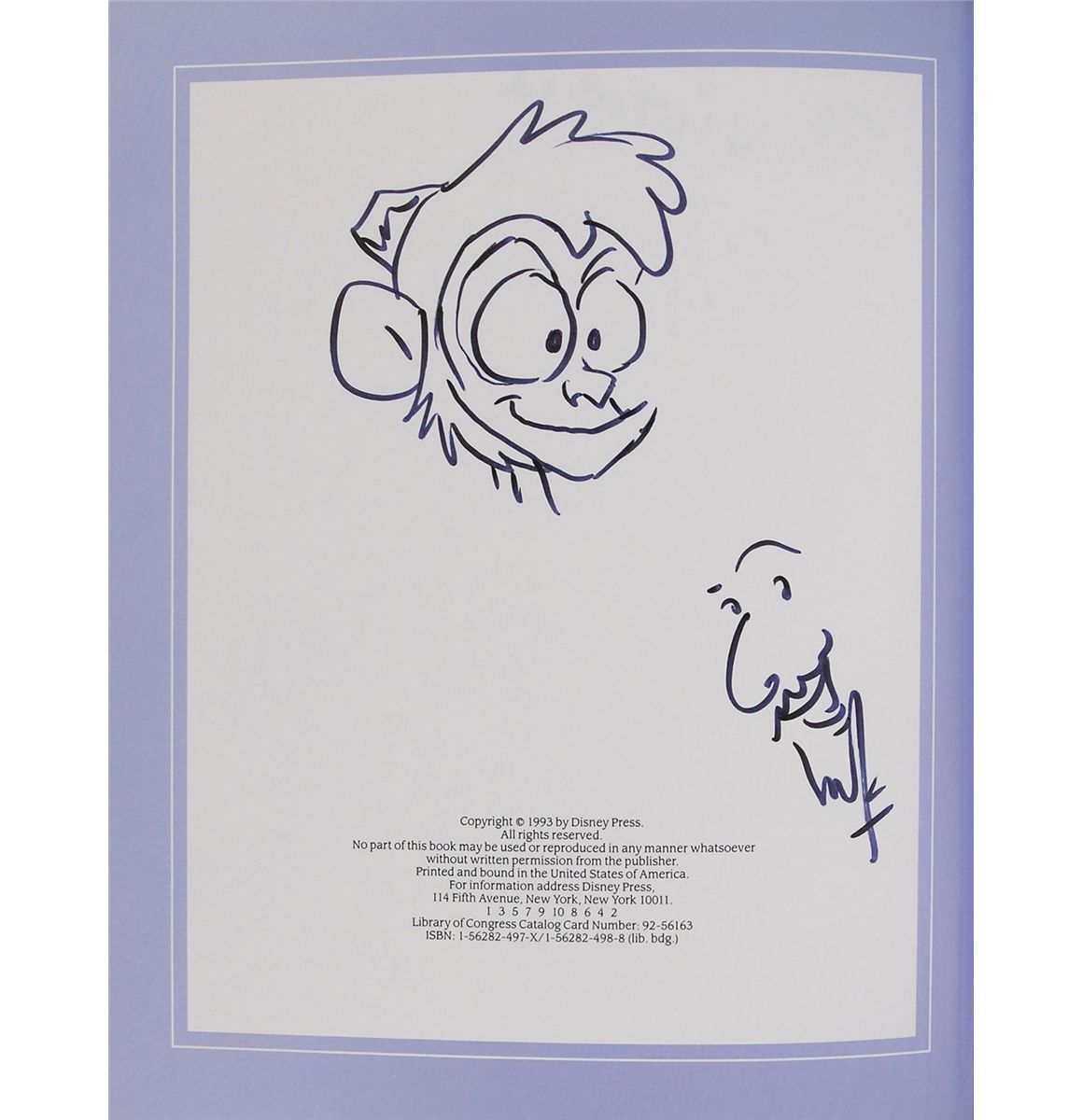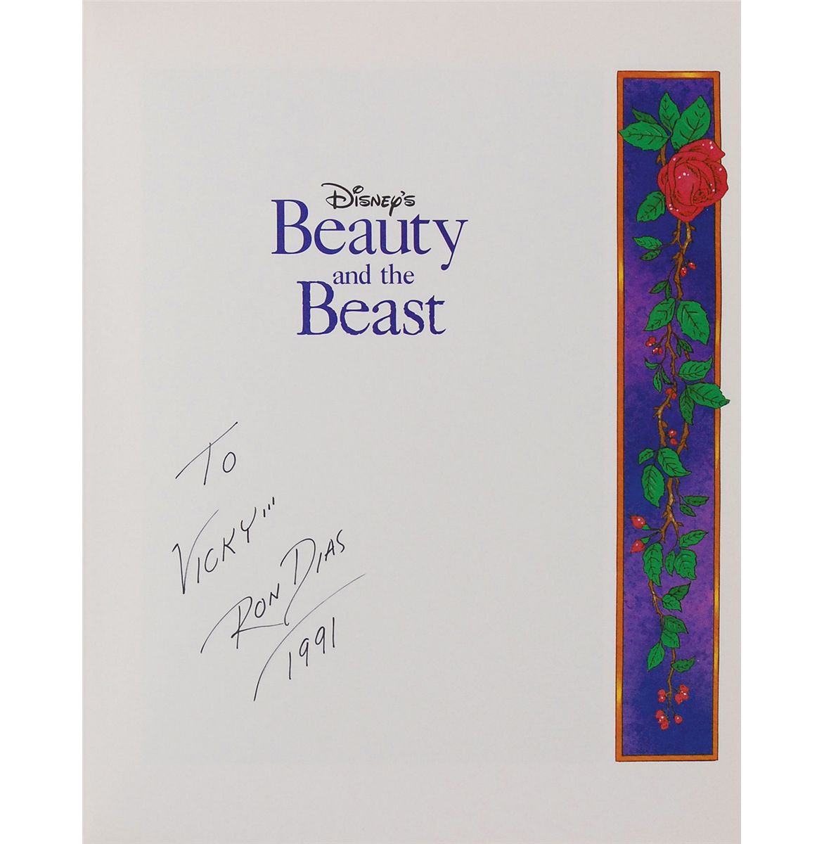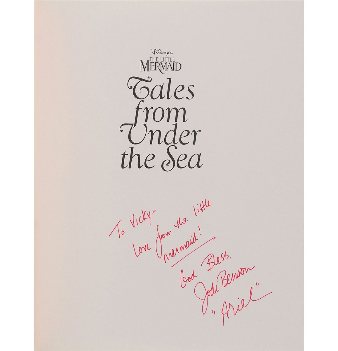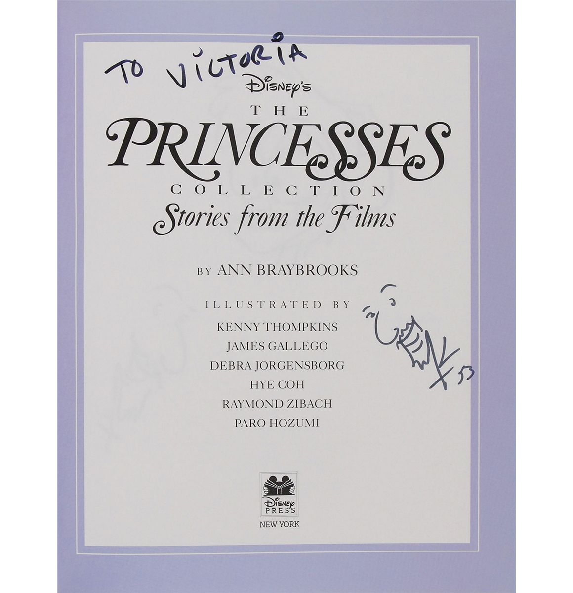 Three hardcover books, each signed and inscribed on an opening page by a related Disney artist or voice actor. Signers are: Ron Dias (Beauty and the Beast), Jodi Benson (Tales from Under the Sea), and Kenny Thompkins (The Princess Collection), signed with two self-portrait sketches and a sketch of Abu from Aladdin on another page. In very fine condition.