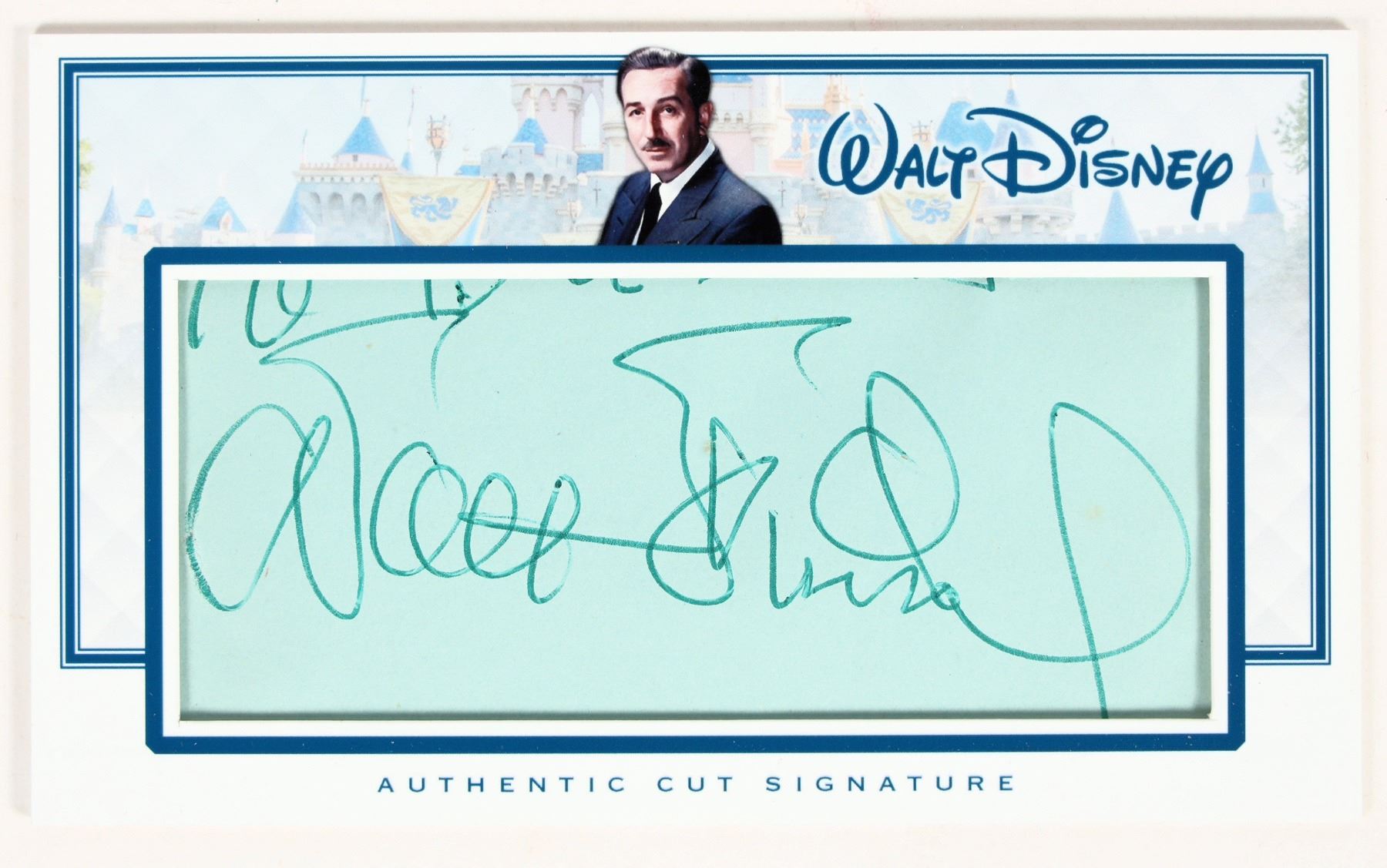 3 x 5" matted autograph with COA from James Spence Authentication in 2022. Walt Disney (1901-1966) was an American animator, filmmaker, and entrepreneur who co-founded The Walt Disney Company. He created some of the most iconic characters in animation history, including Mickey Mouse, and pioneered synchronized sound and full-length animated features. His first feature film, Snow White and the Seven Dwarfs (1937), was a groundbreaking success and launched a new era in entertainment. Disney later expanded into theme parks, opening Disneyland in 1955 and laying the foundation for Walt Disney World. His vision and creativity transformed popular culture, making him one of the most influential figures in entertainment history.