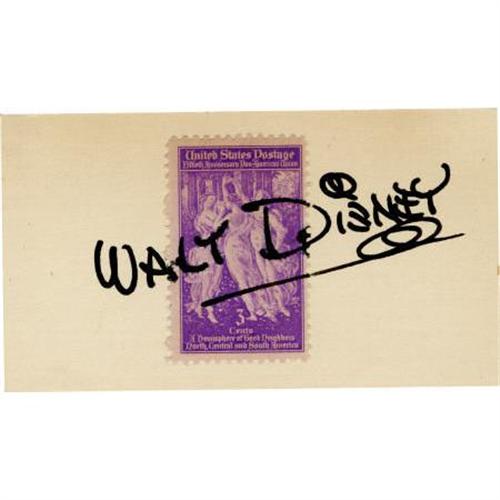 <B>Walt Disney Autograph.</B></I> Walt Disney often carried around pre-signed sheets of paper to give out to fans and autograph hounds (and legend has it Walt's famous trademark signature was designed for him by one of his animators). This particular Disney signature, however, is on a 3.5" x 2" card with a 1940 three-cent postage stamp adhered to it. The card is signed by the founding father of American animation in black ink, in Excellent condition with mild age-toning and glue residue en verso (not affecting signature).<BR><BR><b>Shipping:</b> Flat Material, Small (<a target="_blank" href="http://www.heritageauctions.com/common/shipping.php">view shipping information</a>)