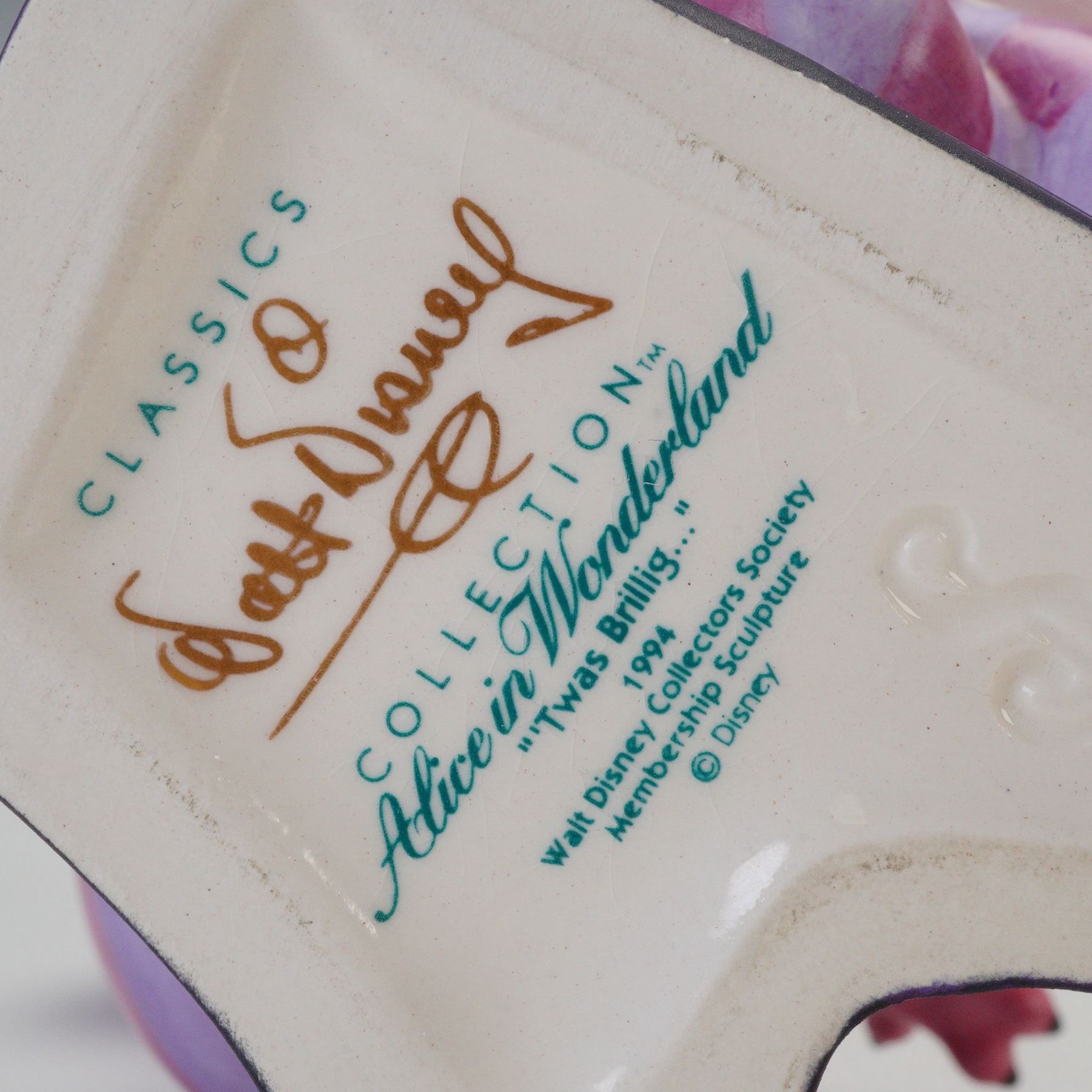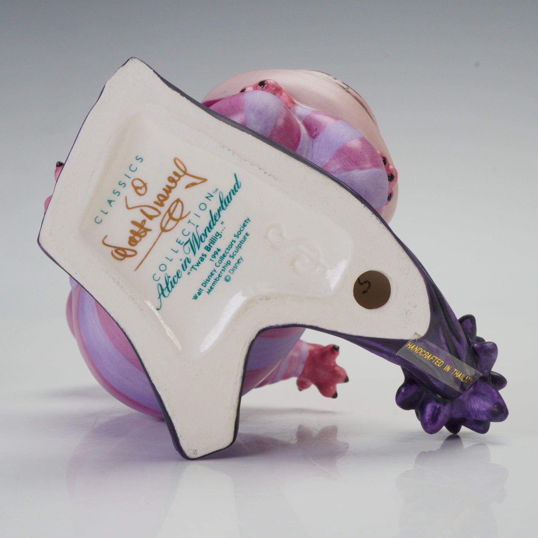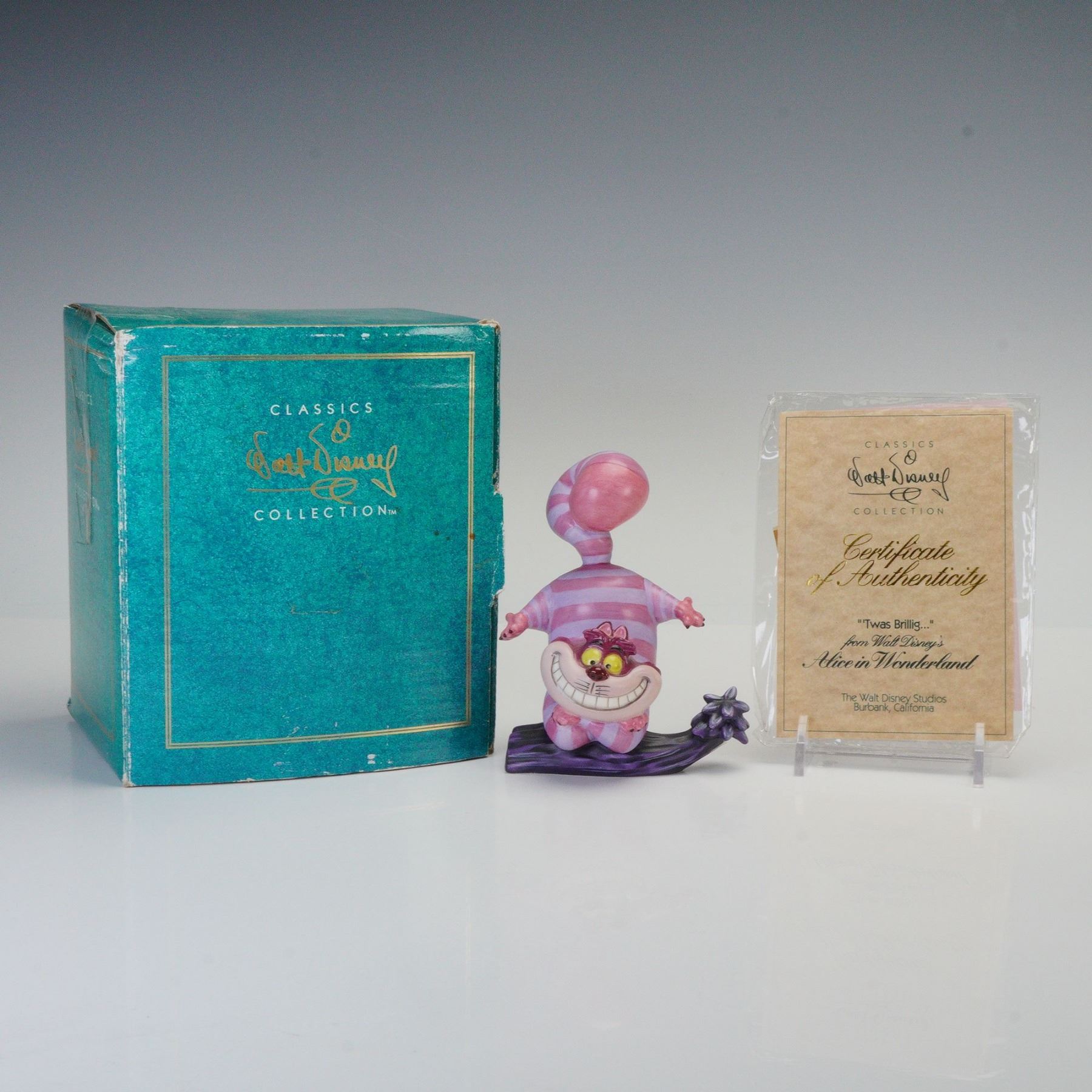 Walt Disney Classics Collection porcelain figure depicting the Cheshire Cat from Alice in Wonderland, titled Twas Brillig, issued in 1994 as a Walt Disney Collectors Society Membership Sculpture. Includes the original Walt Disney Classics Collection box and Certificate of Authenticity. Figure bears printed backstamp with title, date, and WDCS marking.
