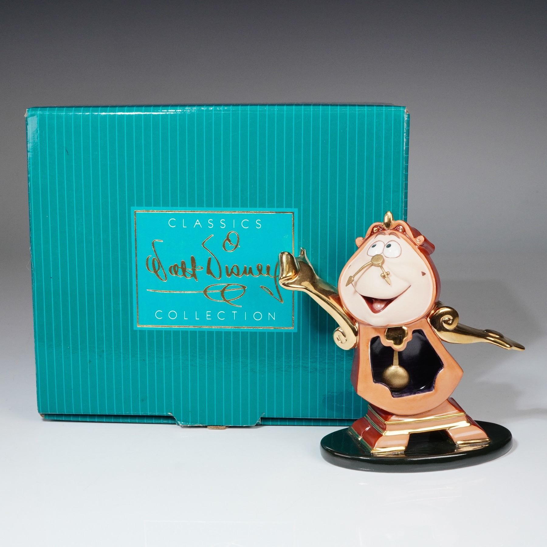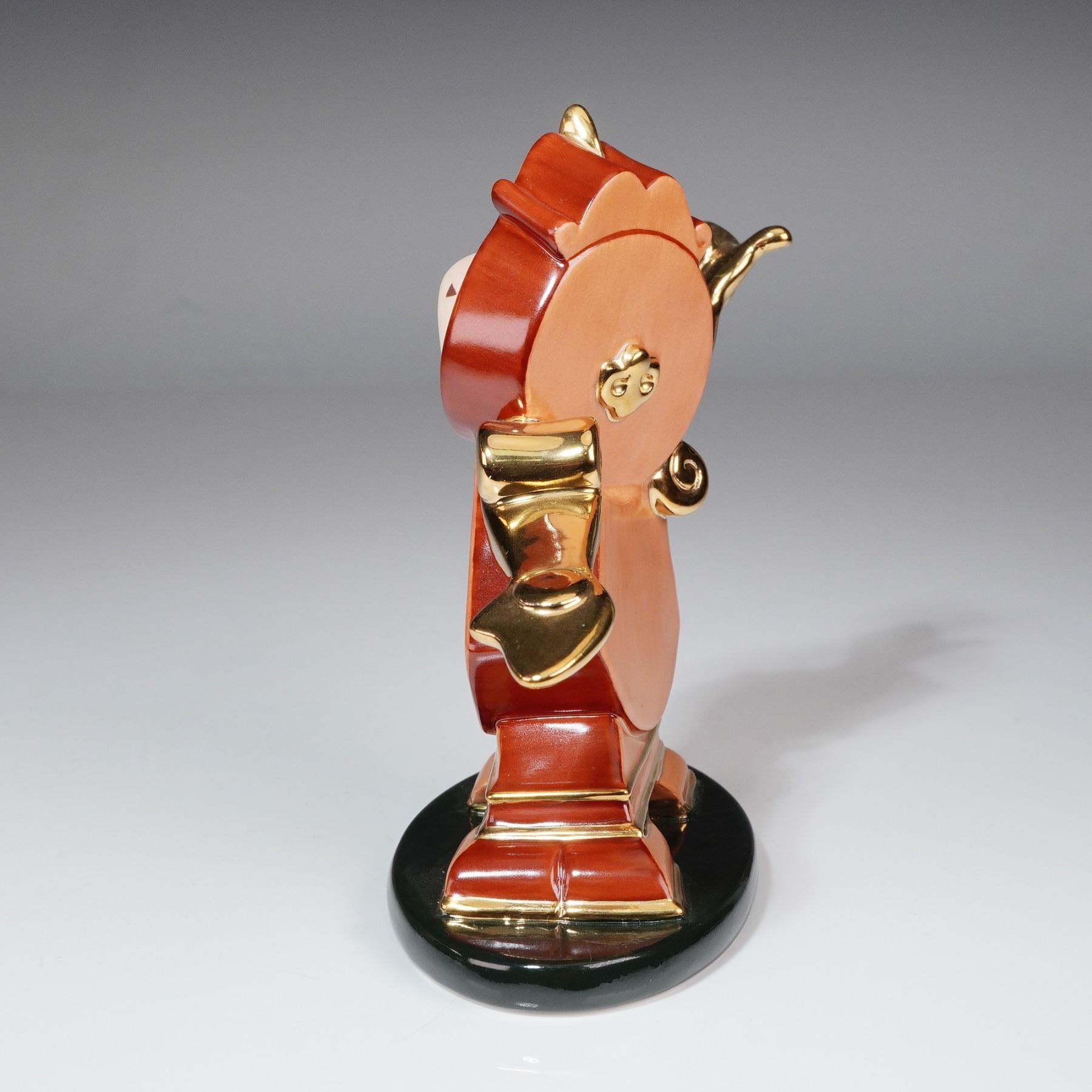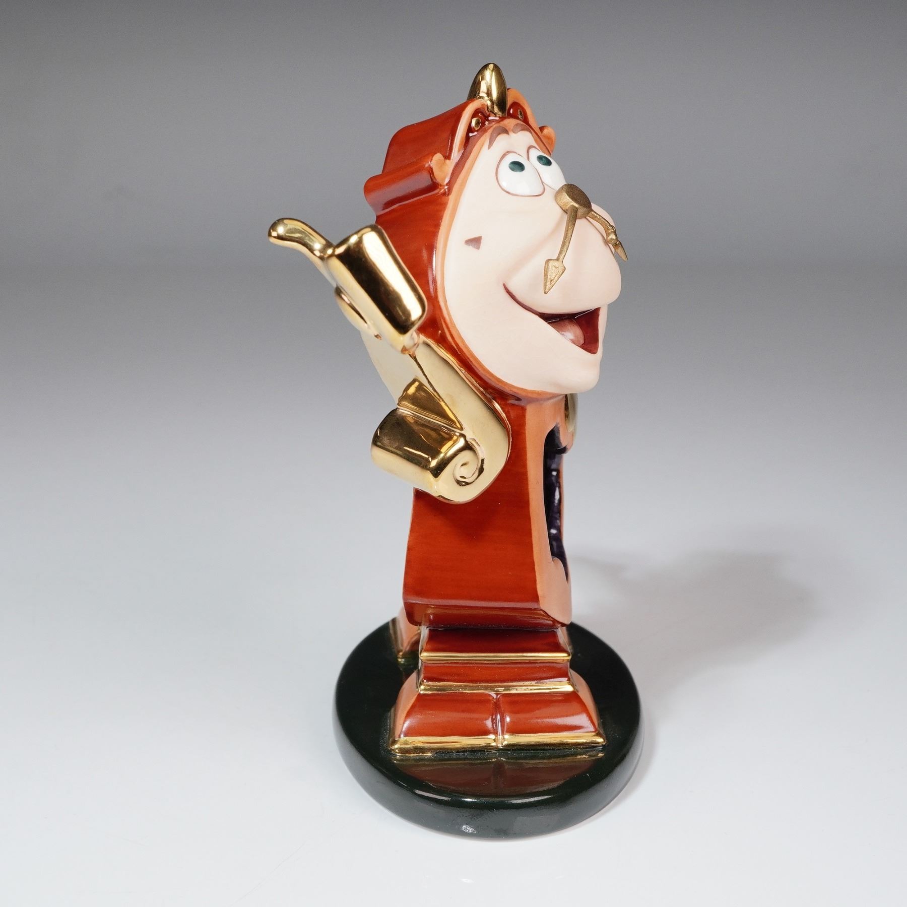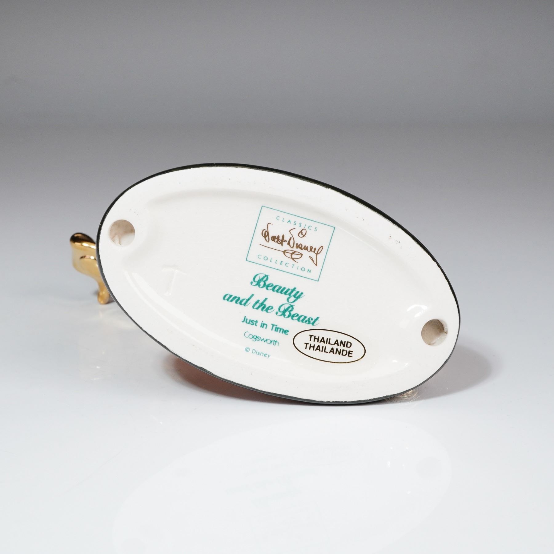 This Walt Disney Classics Collection figurine is titled Just in Time and depicts Cogsworth from Disney's Beauty and the Beast. Rich colors and gilded details emphasize the ornate design of the character, while the interior pendulum actually swings, adding a touch of motion to the display. Complete with its original box, certificate of authenticity, and backstamp, the piece is crafted in porcelain with metallic finishes.