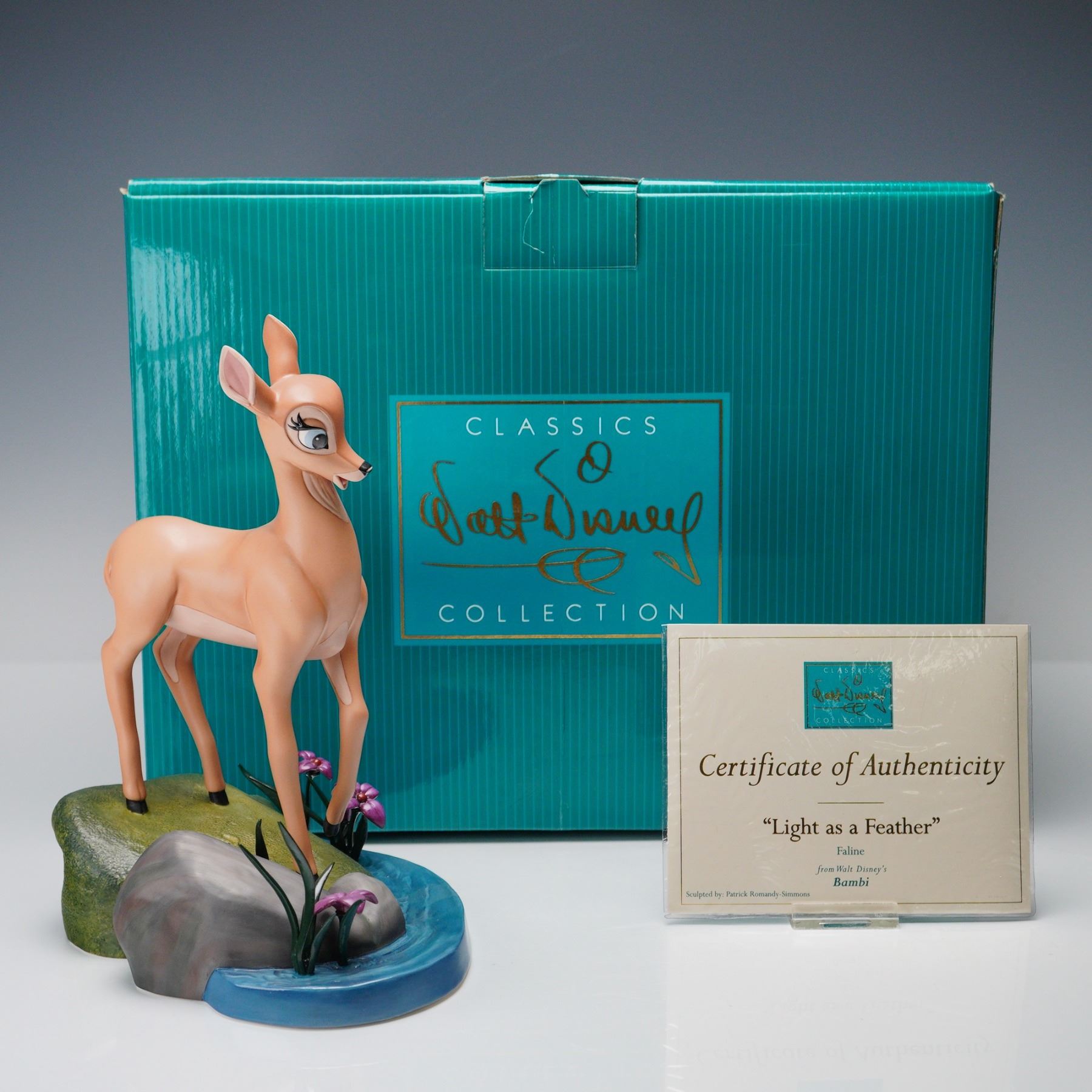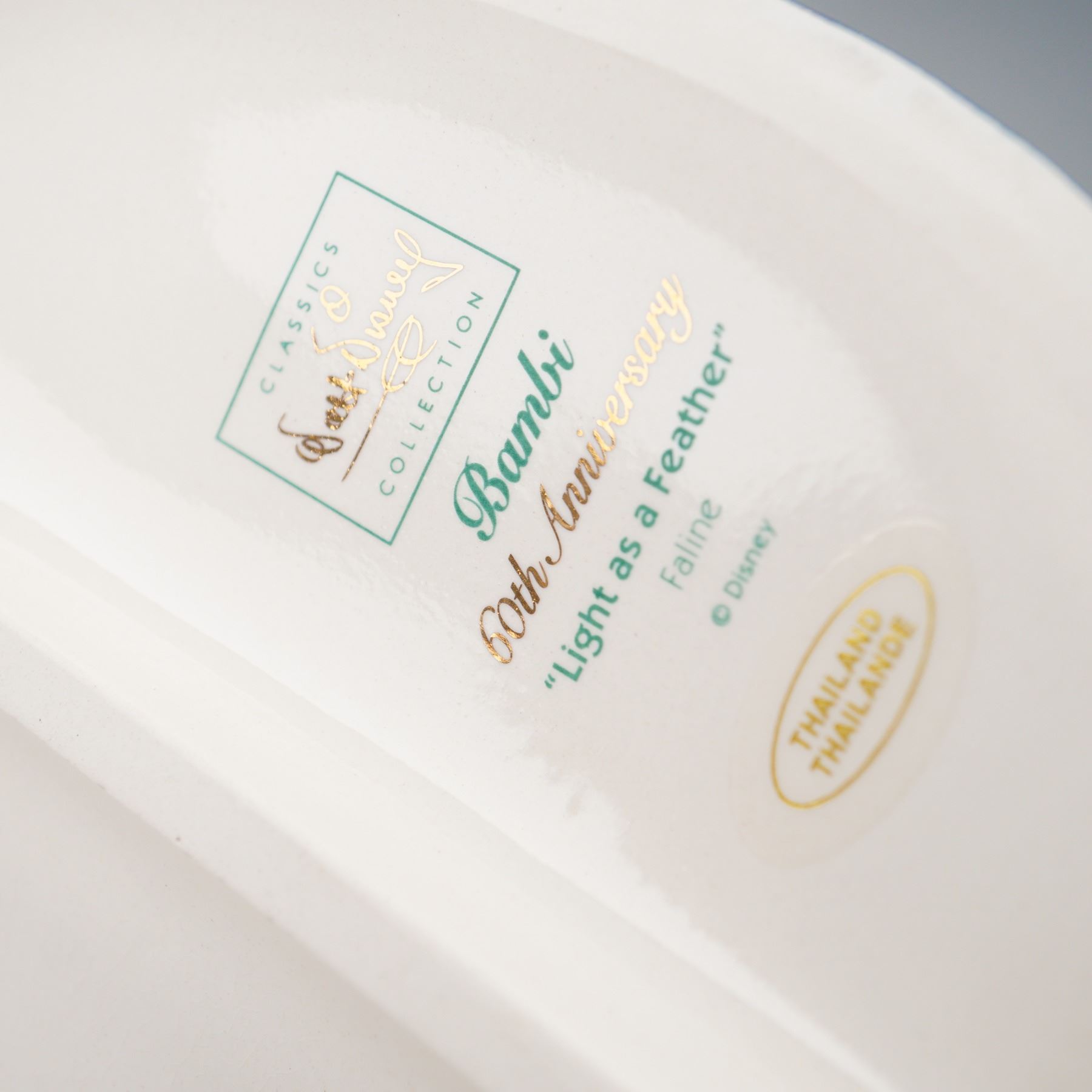 Walt Disney Classics Collection porcelain figurine titled "Light as a Feather," featuring Faline from Walt Disney's Bambi. Released in celebration of the film's 60th Anniversary, this sculpted piece captures Faline gracefully poised beside a stream with floral accents. Beautifully detailed, the figurine comes complete with its original box and certificate of authenticity.