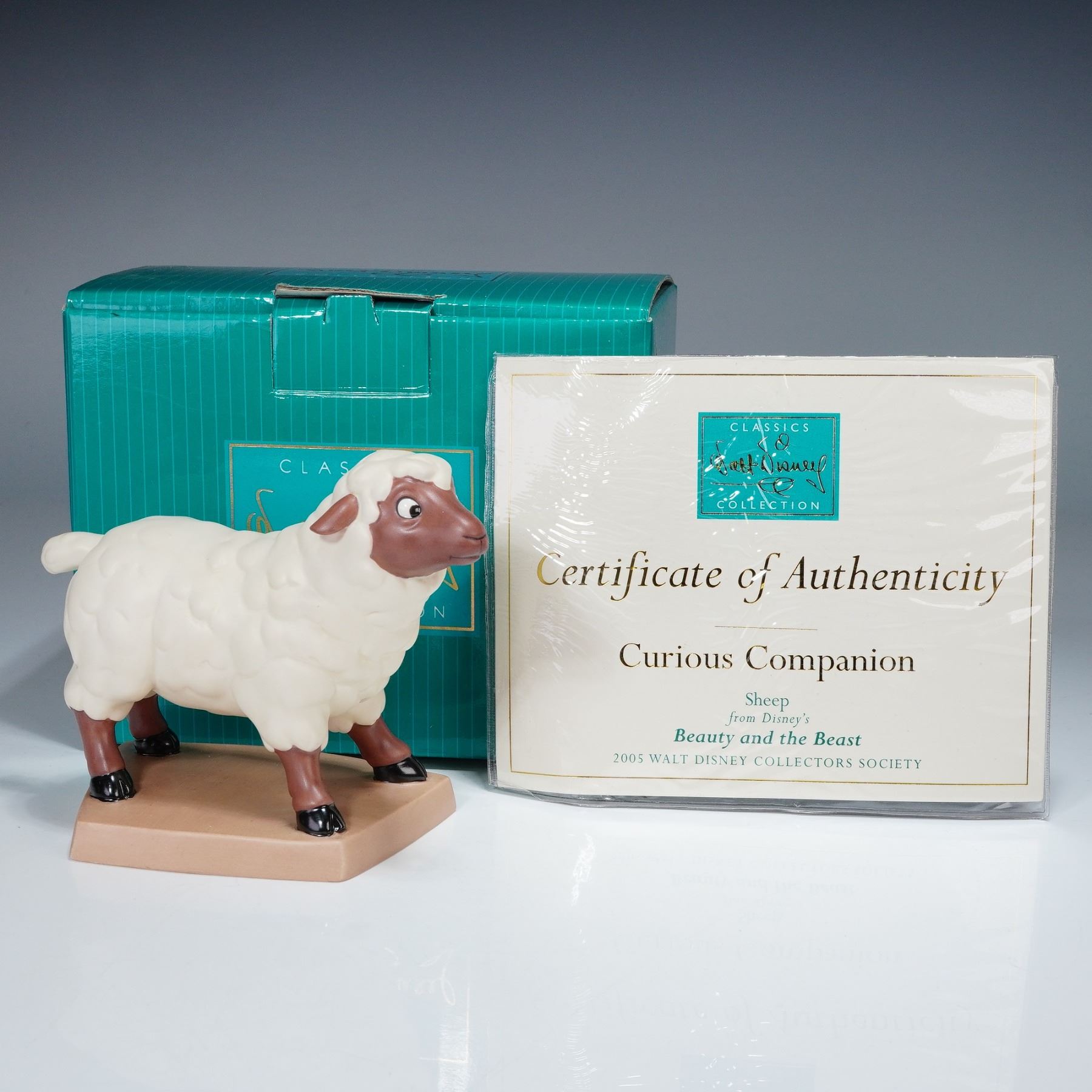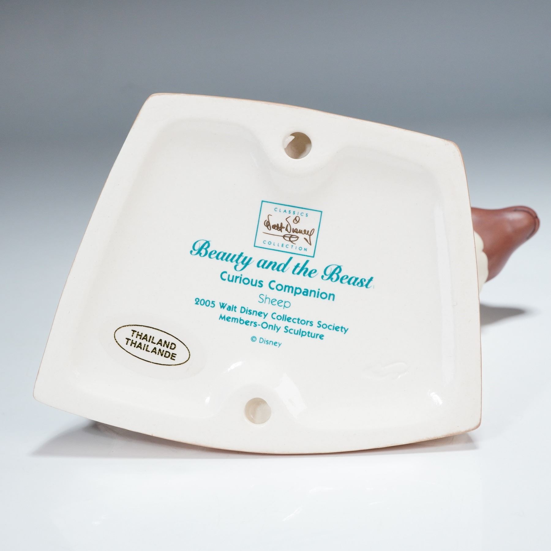 This Walt Disney Classics Collection figurine is titled Curious Companion and depicts the Sheep from Disney's Beauty and the Beast. Released in 2005 as a Walt Disney Collectors Society members-only sculpture, the piece features a finely detailed expression and textured fleece, reflecting the artistry of WDCC craftsmanship. The figurine comes complete with its original box, certificate of authenticity, and backstamp. Crafted in porcelain with hand painted detail.