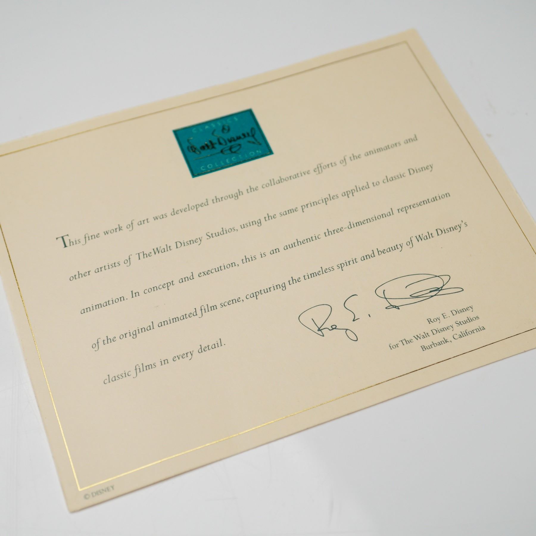 A touching porcelain figure from the Walt Disney Classics Collection, this special edition portrays Mrs. Jumbo cradling young Dumbo in a tender moment titled Baby Mine. Issued exclusively for the Walt Disney Collectors Society, this piece comes with its original box, certificate of authenticity, backstamp, and a character model sheet lithograph created as a special edition feature. The figurine is finely crafted with hand-painted detail, showcasing Disney's timeless artistry and capturing the emotional bond between mother and child.