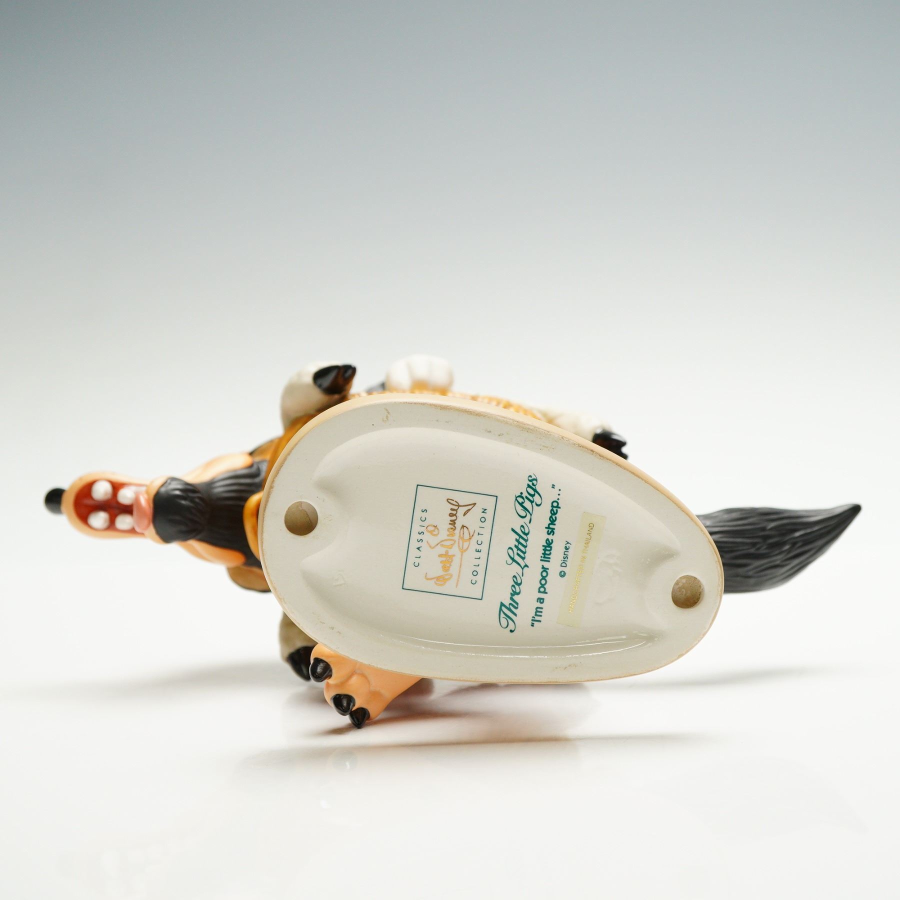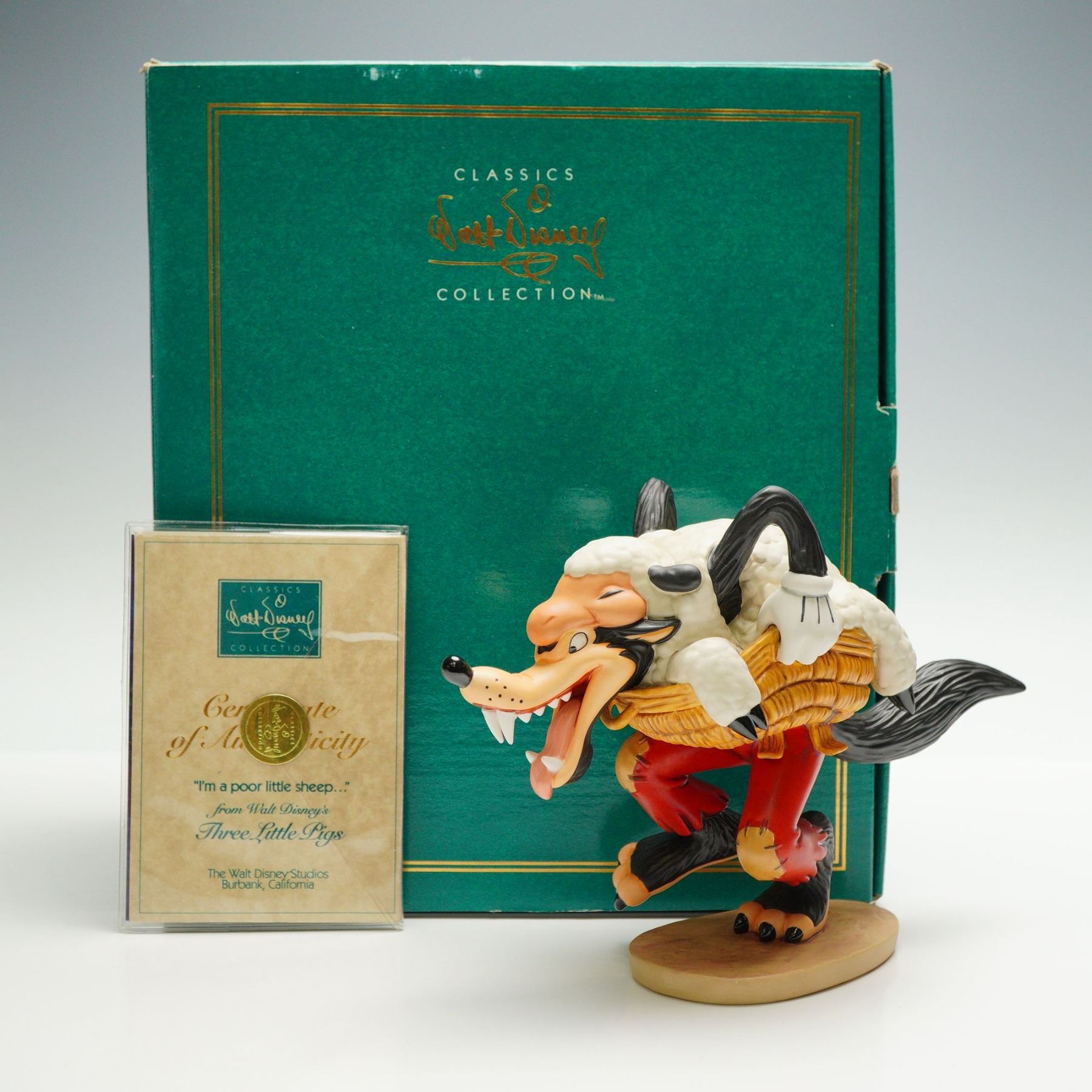 Walt Disney Classics Collection porcelain figurine depicting the Big Bad Wolf disguised as a sheep from the Three Little Pigs, titled I'm a Poor Little Sheep. Includes original green WDCC box and certificate of authenticity. Marked to base with Walt Disney Classics Collection logo and title.