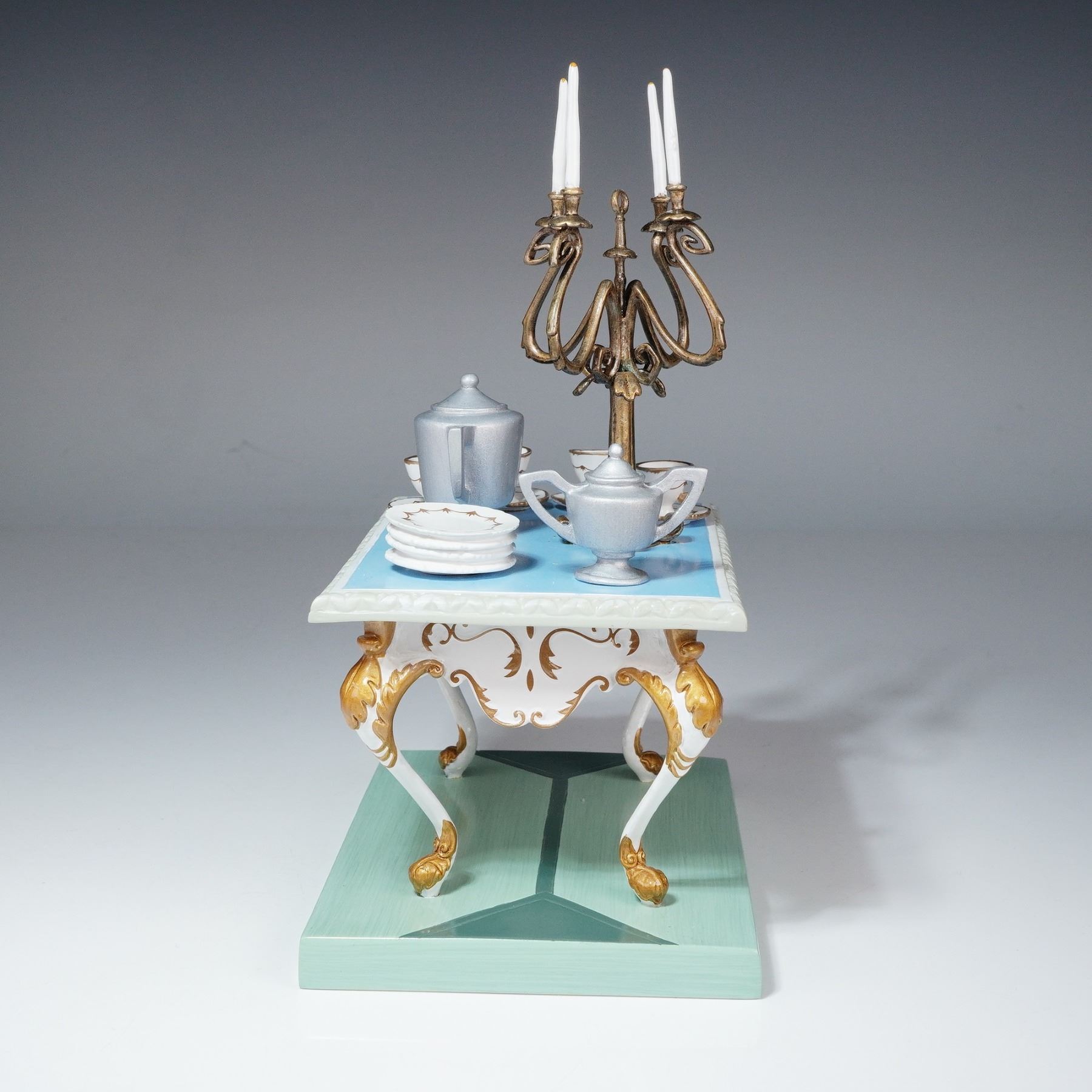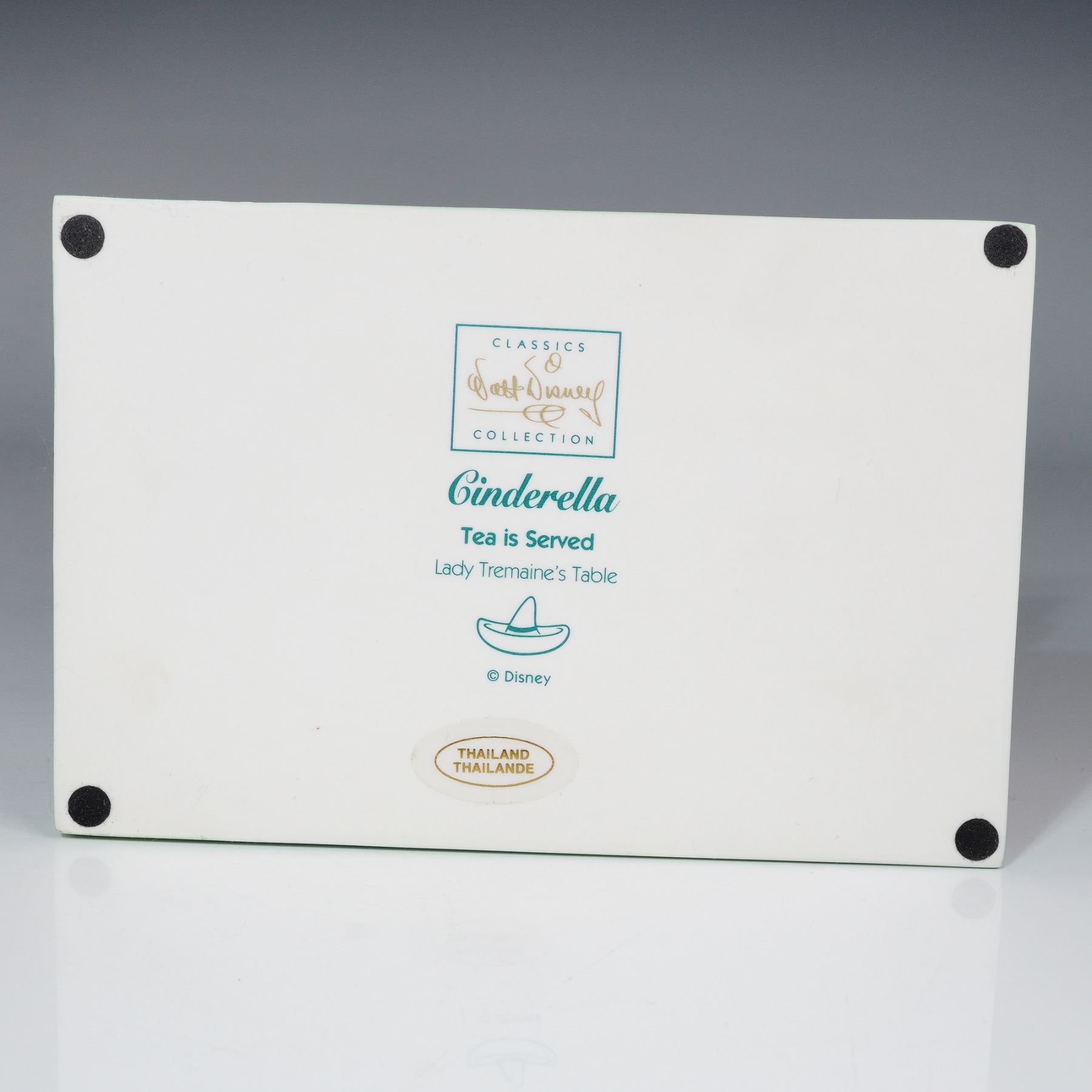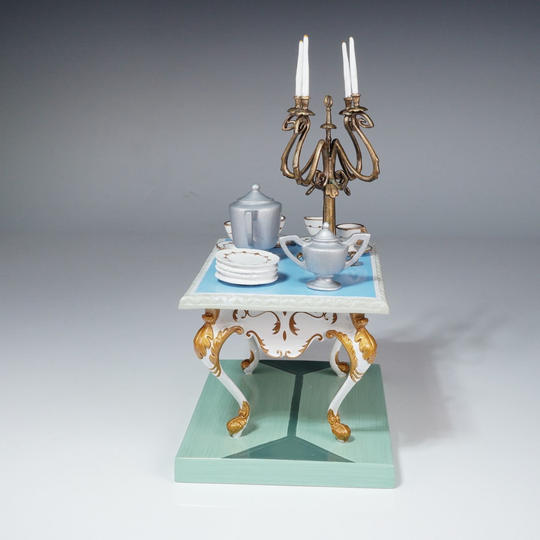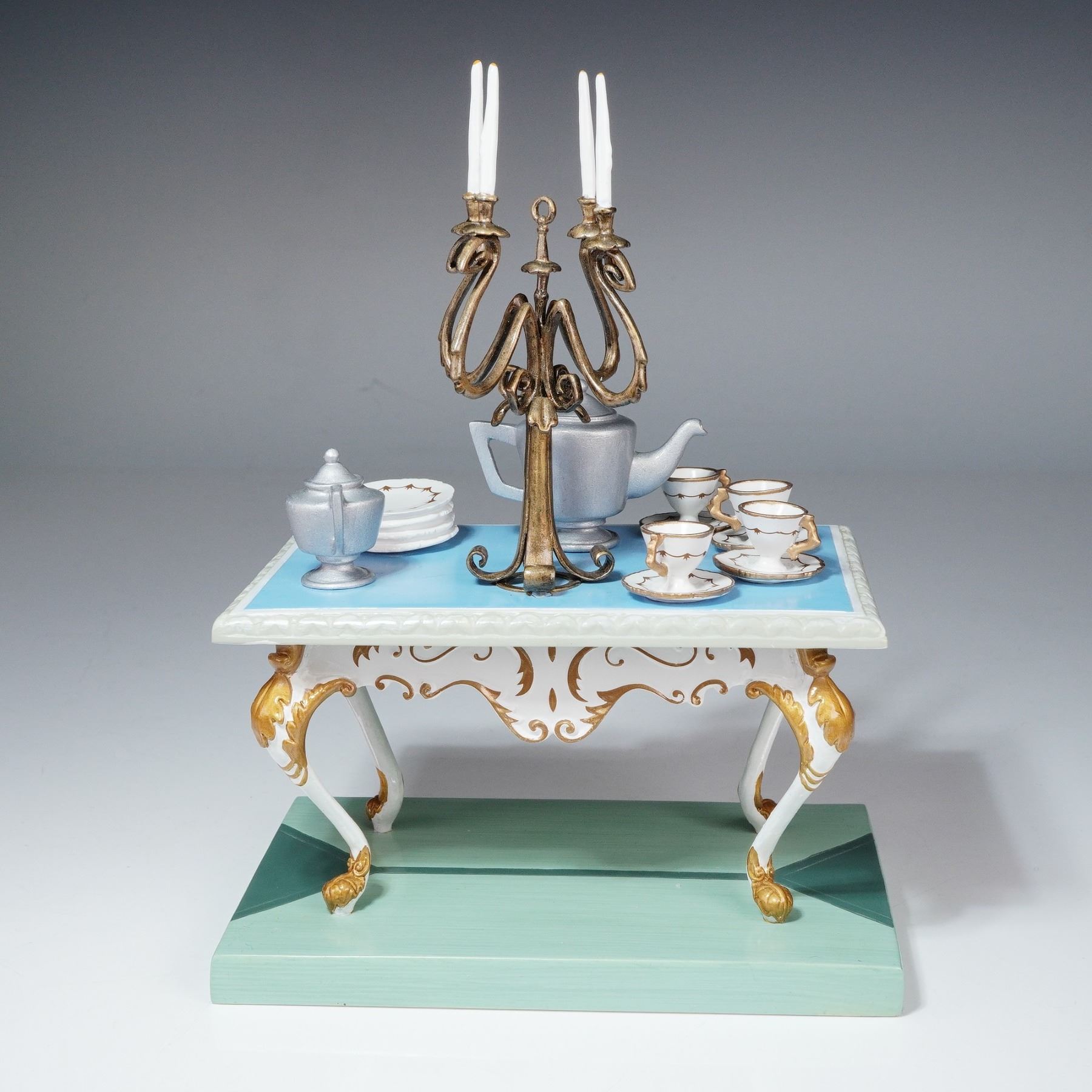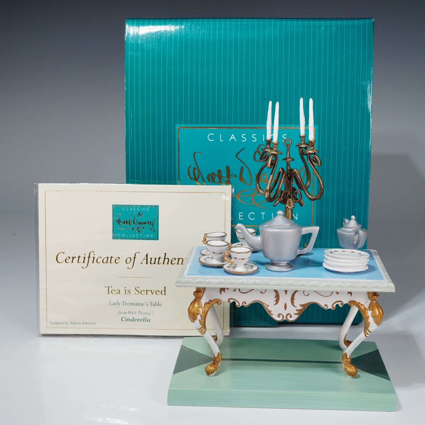 Here is a Walt Disney Classics Collection figurine titled Tea is Served, portraying Lady Tremaine's Table from Disney's Cinderella. The ornate table is topped with a candelabra, teapot, teacups, plates, and sugar bowl, all crafted with intricate detail and highlighted with gilt accents. A unique accessory piece in the line, it is offered with original box, certificate of authenticity, and backstamp.