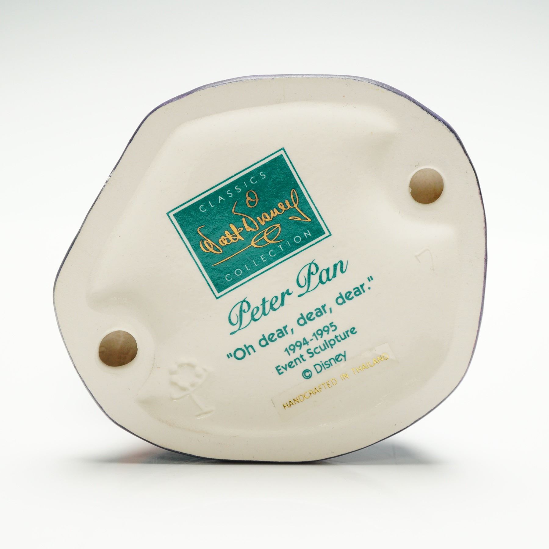 Walt Disney Classics Collection porcelain figurine depicting Smee from Peter Pan, titled Oh Dear Dear Dear. Issued as a 1994-1995 Event Sculpture, handcrafted in Thailand. The figure shows Smee with his signature blue striped shirt and cheerful expression. Includes the original WDCC green box and certificate of authenticity.