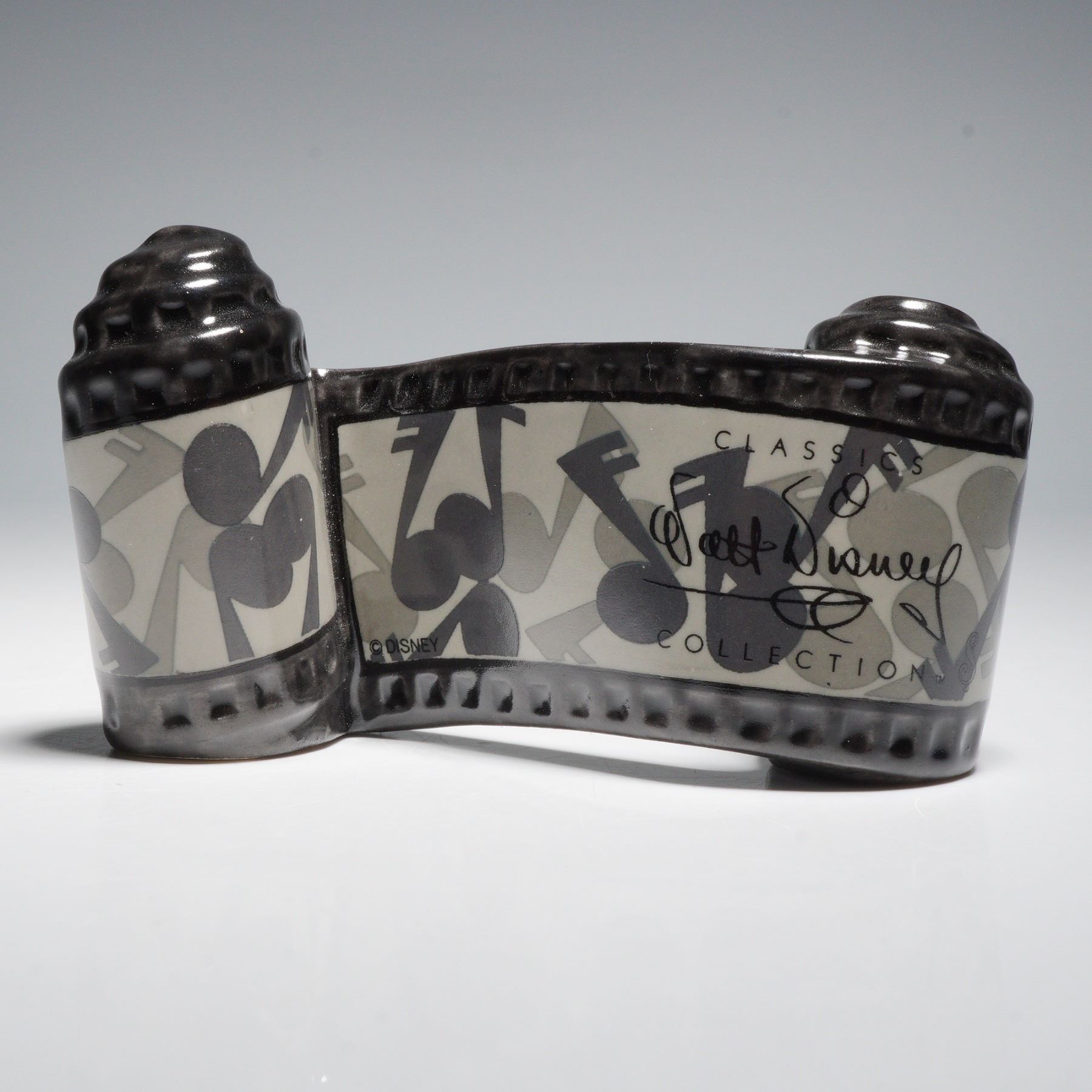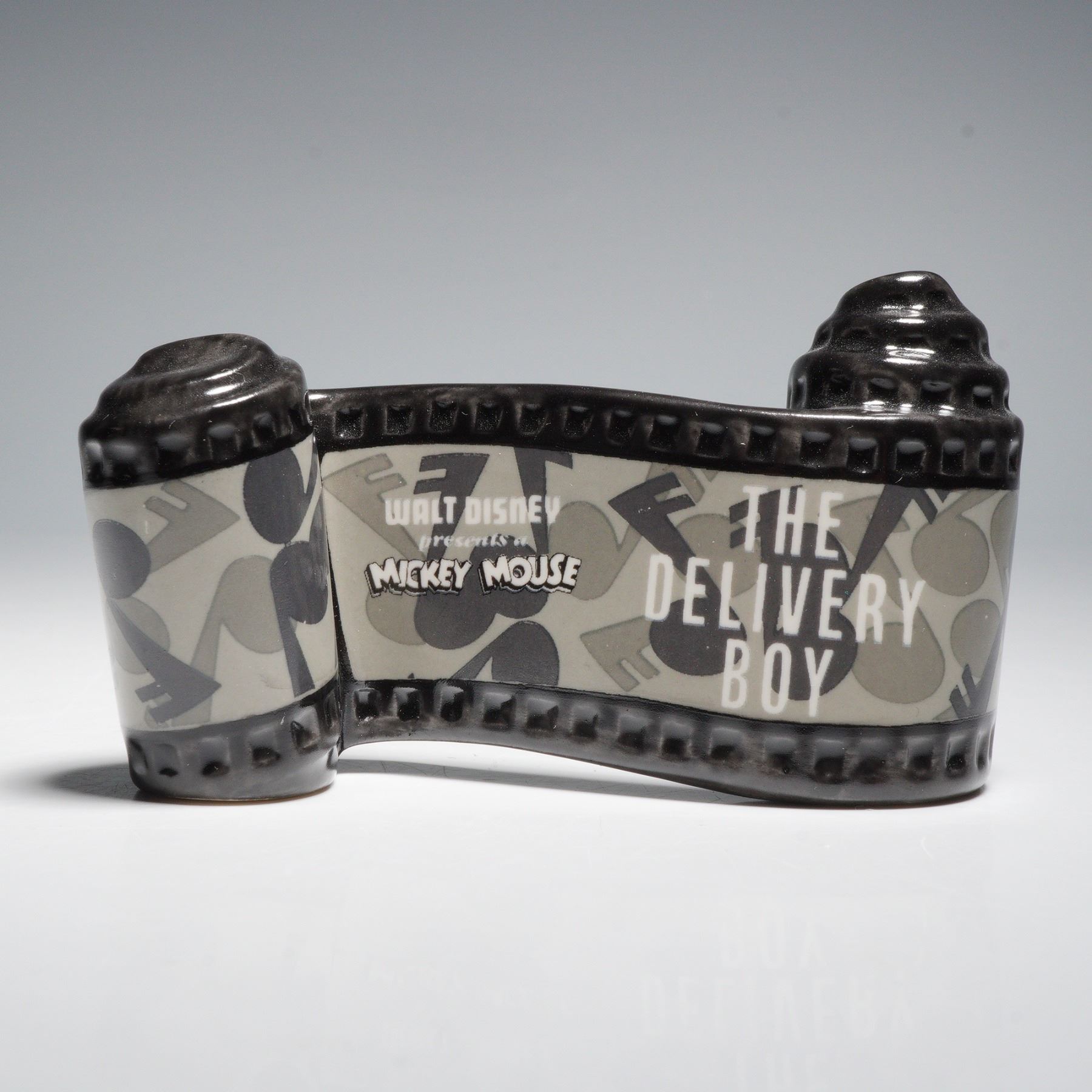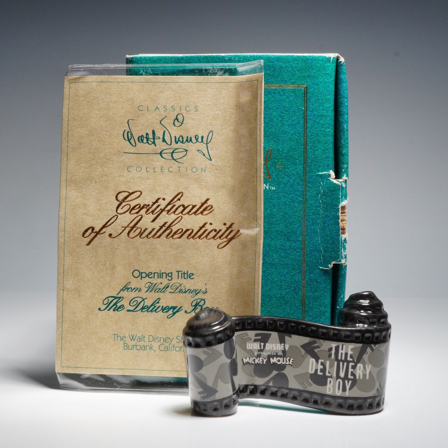 Walt Disney Classics Collection ceramic title from Mickey Mouse's 1931 short film The Delivery Boy. The sculpted filmstrip design reads Walt Disney presents Mickey Mouse The Delivery Boy in raised lettering over a stylized monochrome background. Includes the original green WDCC box and Certificate of Authenticity.