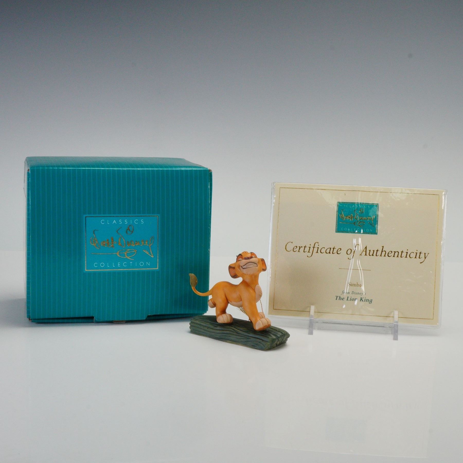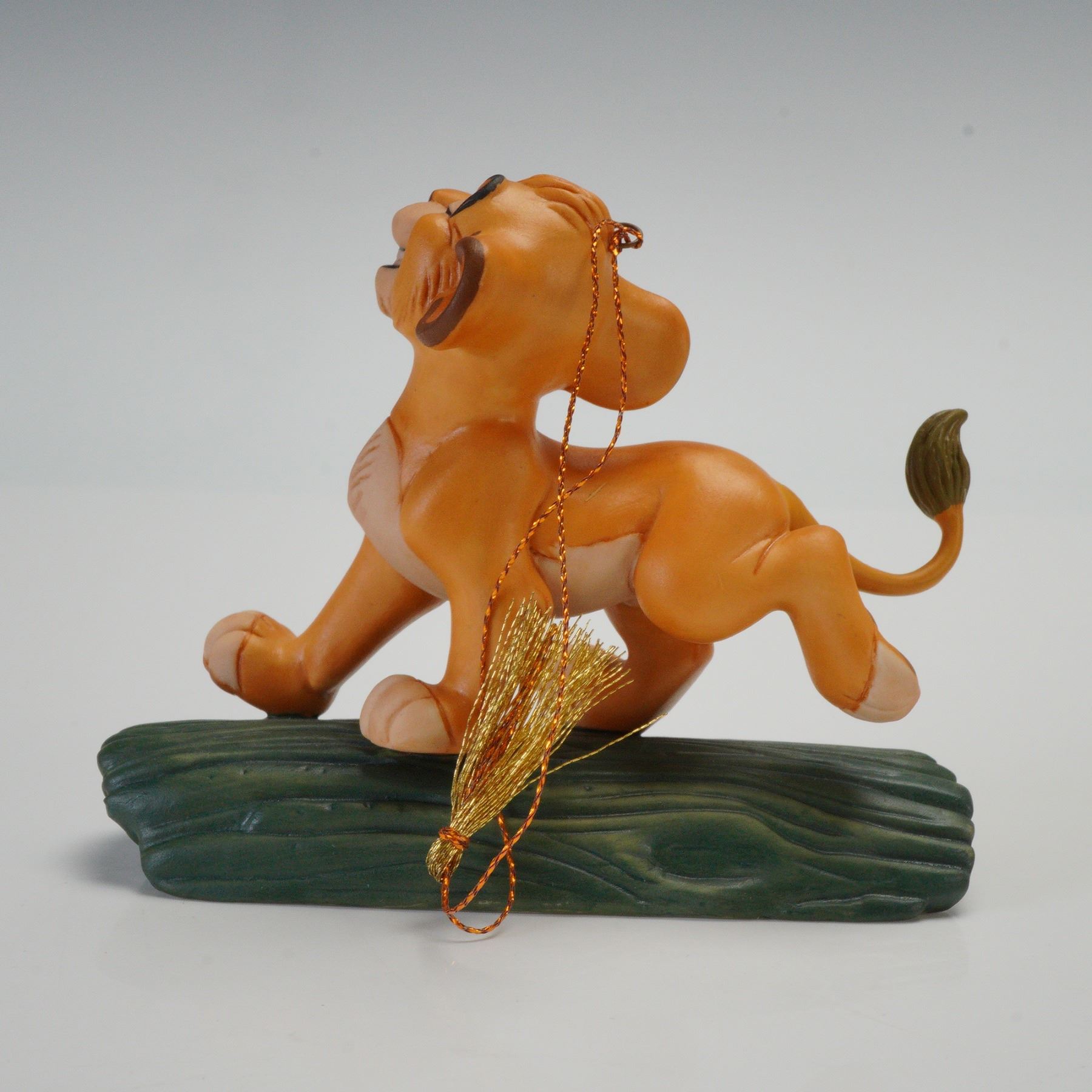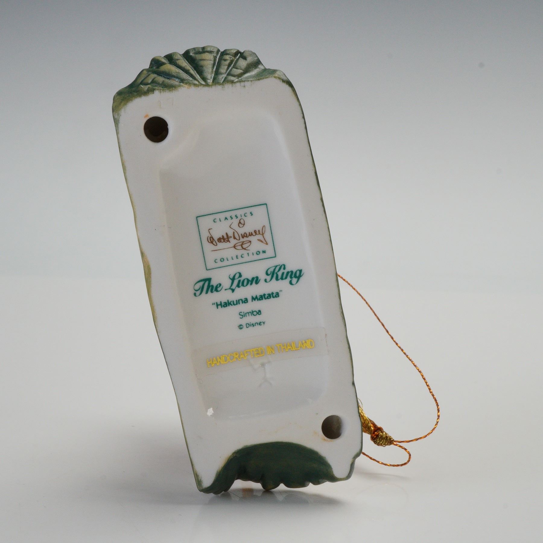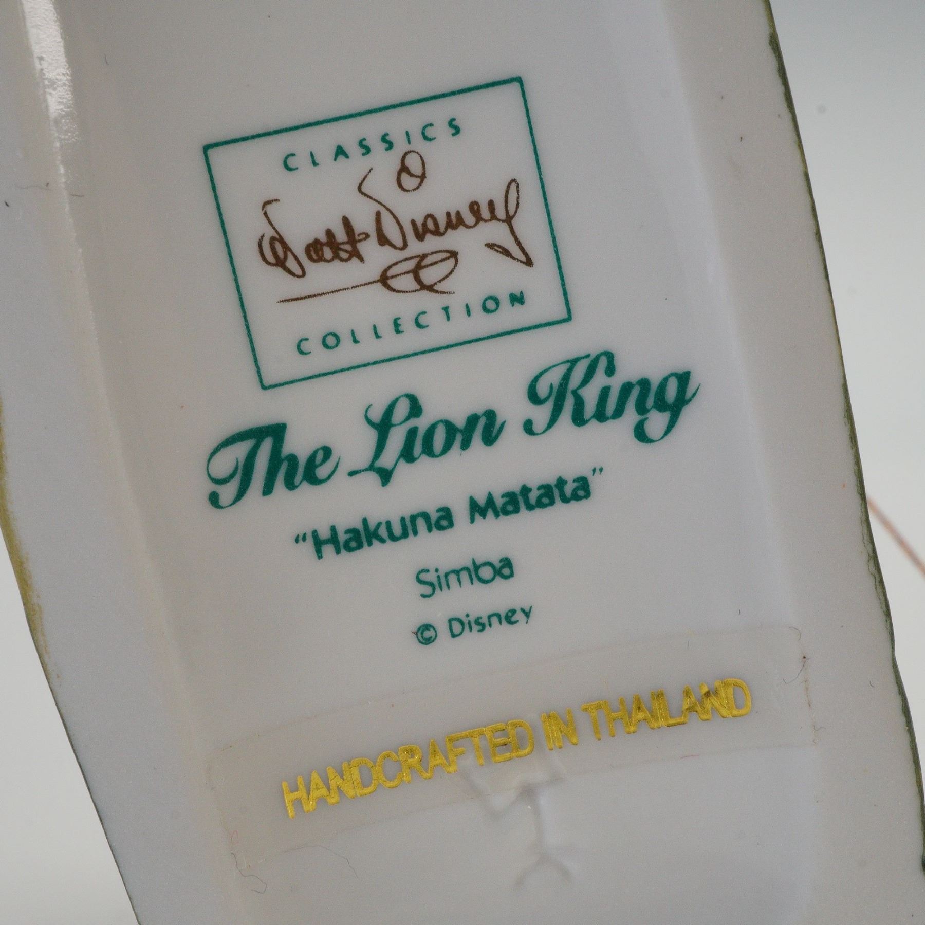 Simba from The Lion King in a playful pose atop a textured green base. The porcelain piece includes a hanging gold cord and tassel and bears the Walt Disney Classics Collection logo on the underside, labeled "The Lion King," "Hakuna Matata," and "Simba." The lot is accompanied by its original box and Certificate of Authenticity. Handcrafted in Thailand. Model No. 1028647.