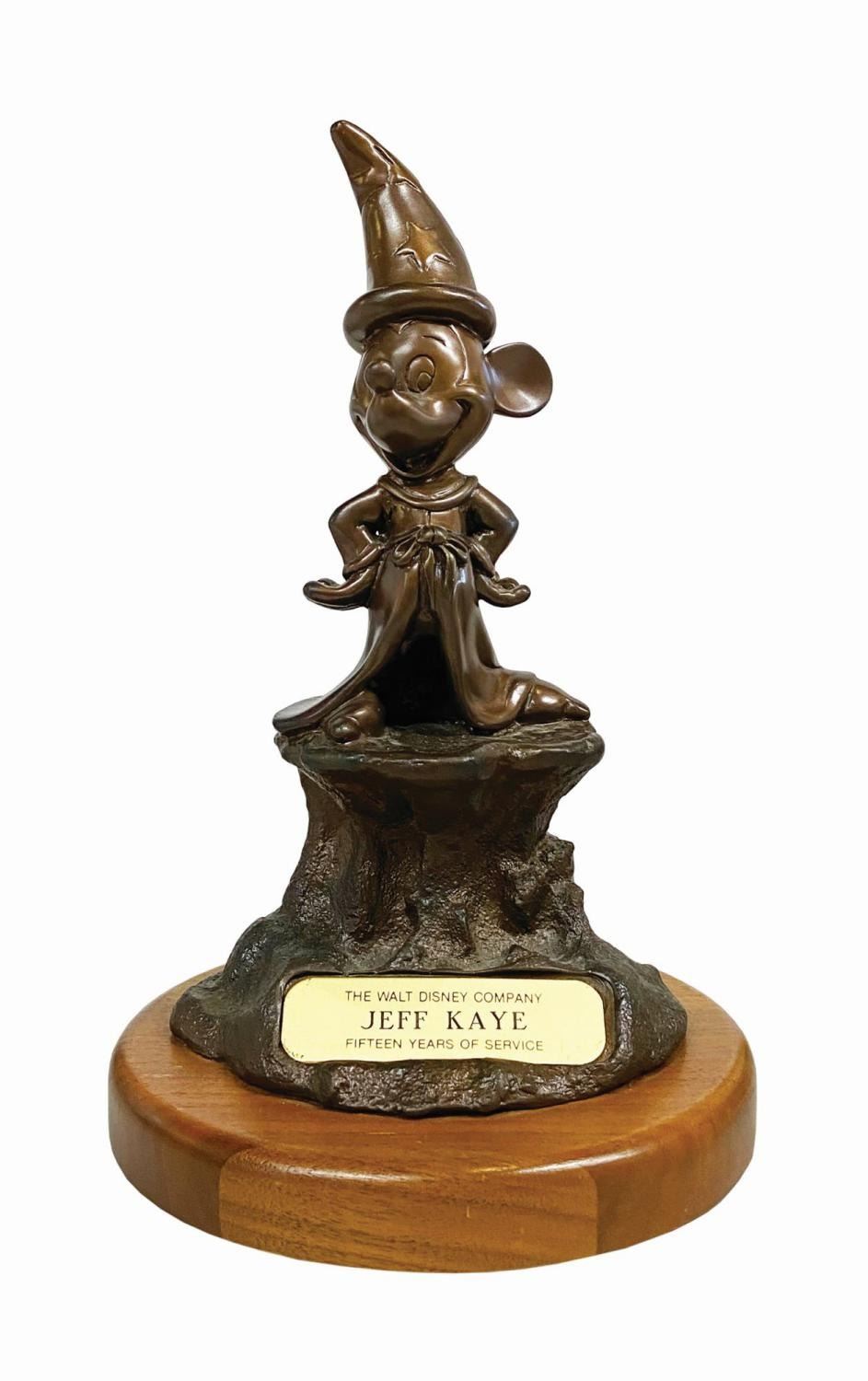 (Disney, c.1980s) A bronze fifteen year service award issued to an employee of the Walt Disney Company. This beautiful award features Sorcerer's Apprentice Mickey atop a rocky platform with a wooden base. A plaque with the employee name is attached near the base of the bronze. Measuring 8.5" tall on the 5.75" diameter base, the award is in very good condition with some areas of surface wear to the wood and minor scratching to the plaque.