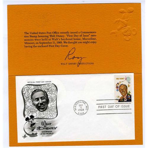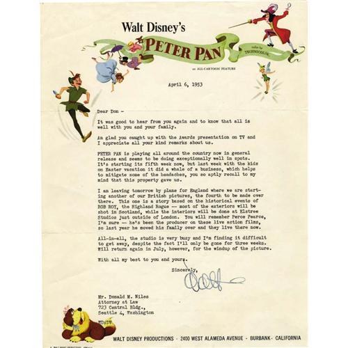<B>Walt Disney Correspondence and First Day Envelope (1953-68).</B></I> This interesting lot includes a typed letter to a former Disney employee from Walt Disney, on full color ""Peter Pan"" stationary, dated April 6, 1953. In it, Mr. Disney discusses how ""Peter Pan"" was doing at the box office in its fifth week of release, and reveals details about his upcoming live-action feature, ""Rob Roy,"" and he signed the letter as ""Walt"", in blue ink. Also included is a special presentation of the 1968 Walt Disney First Day of Issue (September 11, 1968) stamped envelope, a copy of a letter of thanks to Roy Disney, and Roy's reply, dated November 7, 1968. Also included is a note from Madeleine Wheeler (Walt's personal secretary), written on Mickey Mouse notepaper. All items are in Very Good to Excellent condition.<BR><BR><b>Shipping:</b> Flat Material, Small (<a target=""_blank"" href=""http://www.heritageauctions.com/common/shipping.php"">view shipping information</a>) <BR><BR><B>Important notic