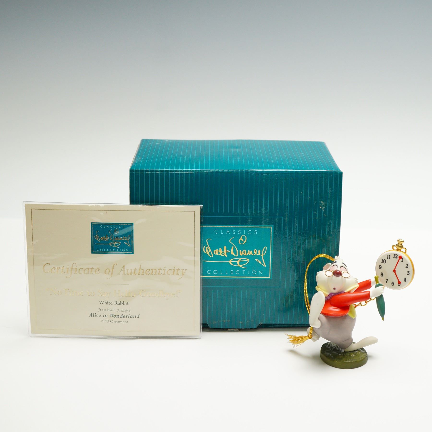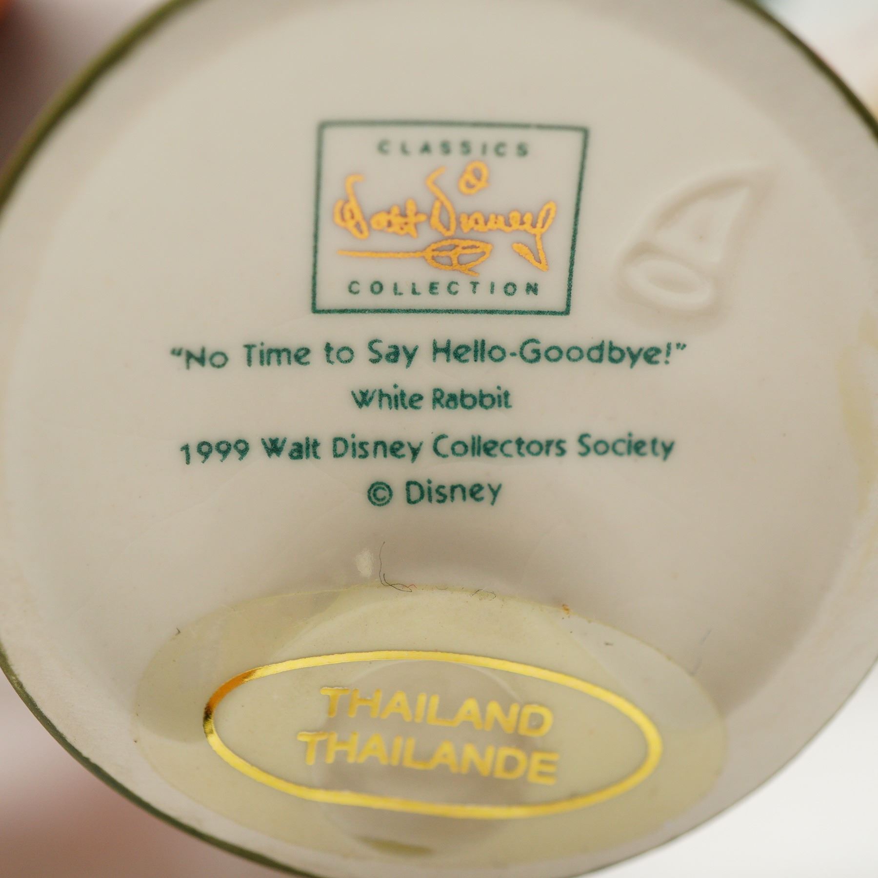 Walt Disney Classics Collection porcelain figurine titled White Rabbit, No Time to Say Hello-Goodbye, from the 1999 Walt Disney Collectors Society series inspired by Alice in Wonderland. Includes original box and Certificate of Authenticity. Marked on base with Walt Disney Classics Collection backstamp.