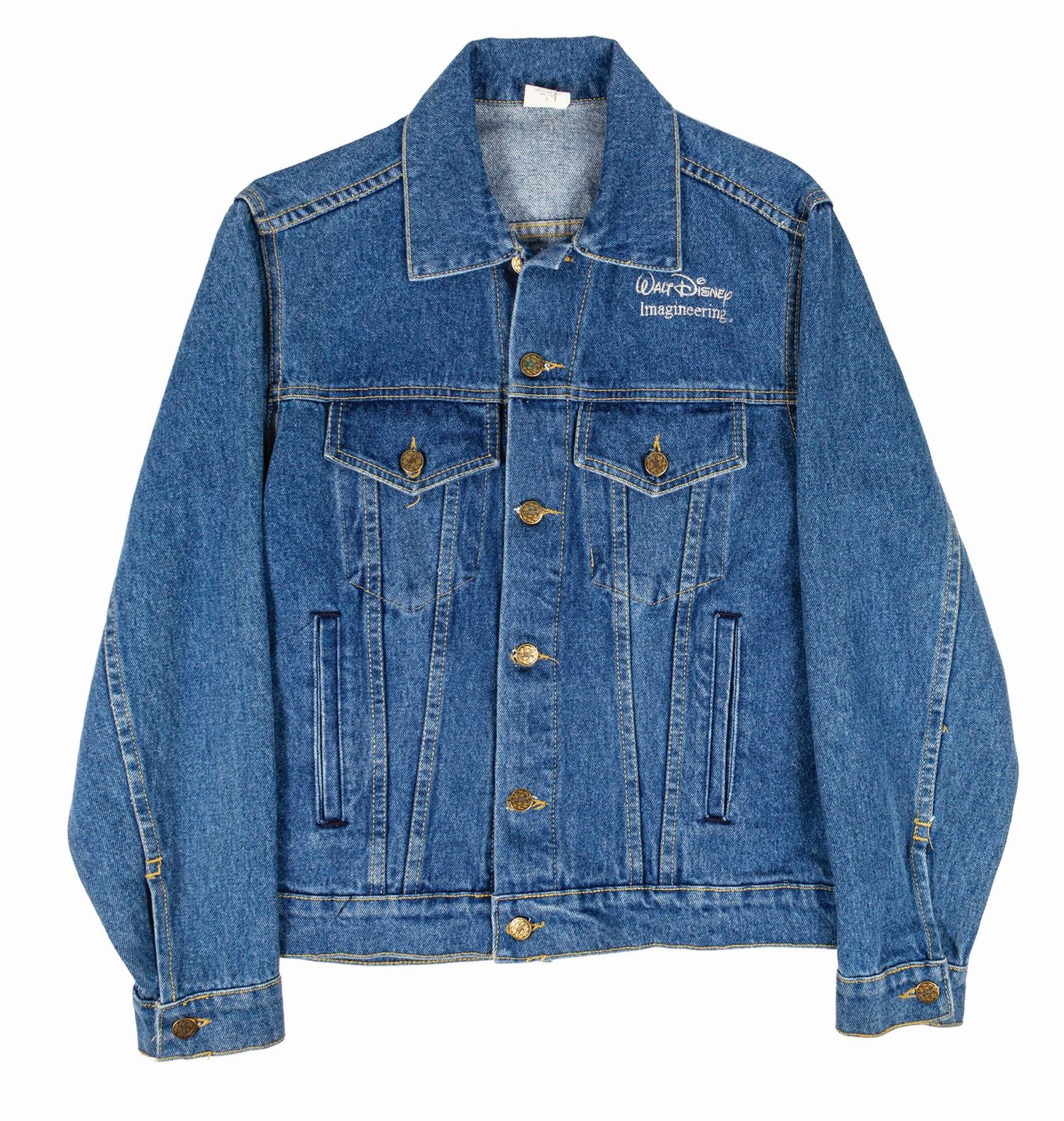 (Disneyland, c.1990s) A rare denim jacket created for members of Walt Disney Imagineering. The chest and back both read "Walt Disney Imagineering" with Imagineering's Sorcerer Mickey Mouse logo proudly depicted on the back. The jacket is a size small and is in very good condition with minor wear.