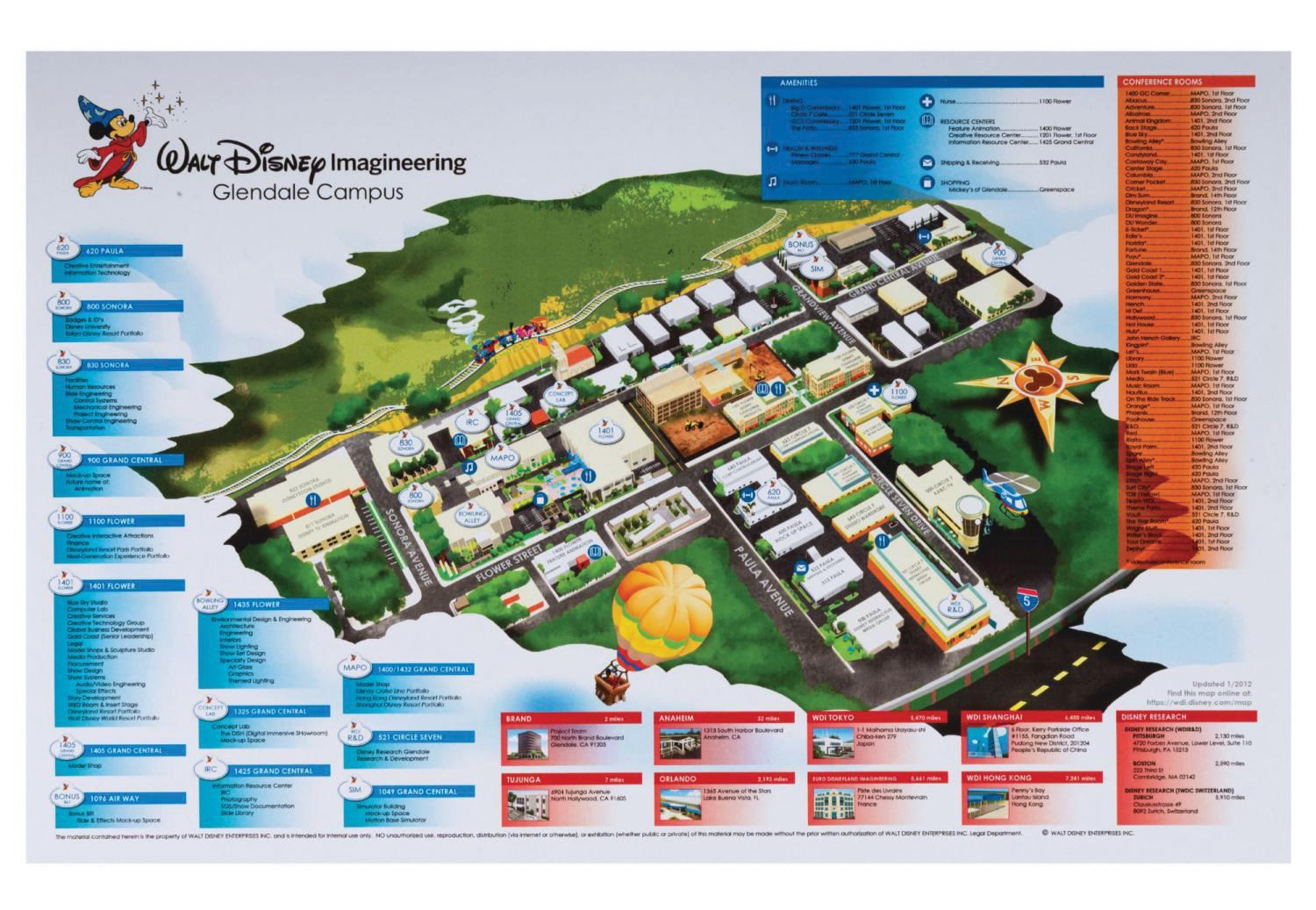 (Disney, 2012) A Walt Disney Imagineering Glendale Campus Map depicting "where the magic happens." The Imagineer-owned and used map illustrates and details the facilities once utilized for Disney TV Animation, Disneytoon Studios, Disney Interactive, MAPO, KABC-TV, Disney Consumer Products, dining, health and wellness, and even the WDI Bowling Alley. Measuring 11"x17", the colorful printed map displays in fine condition, exhibiting only the slightest wear to the edges.