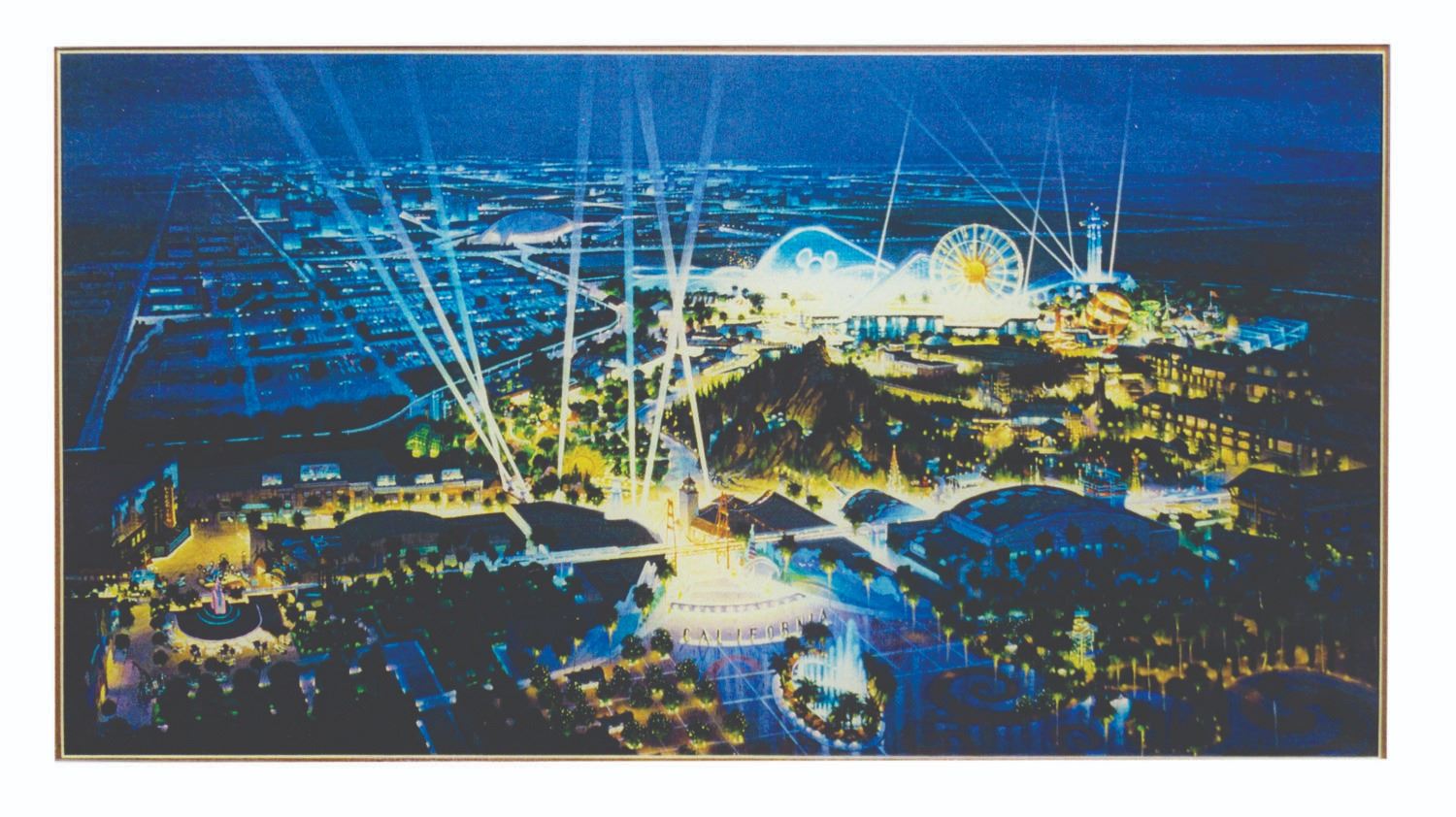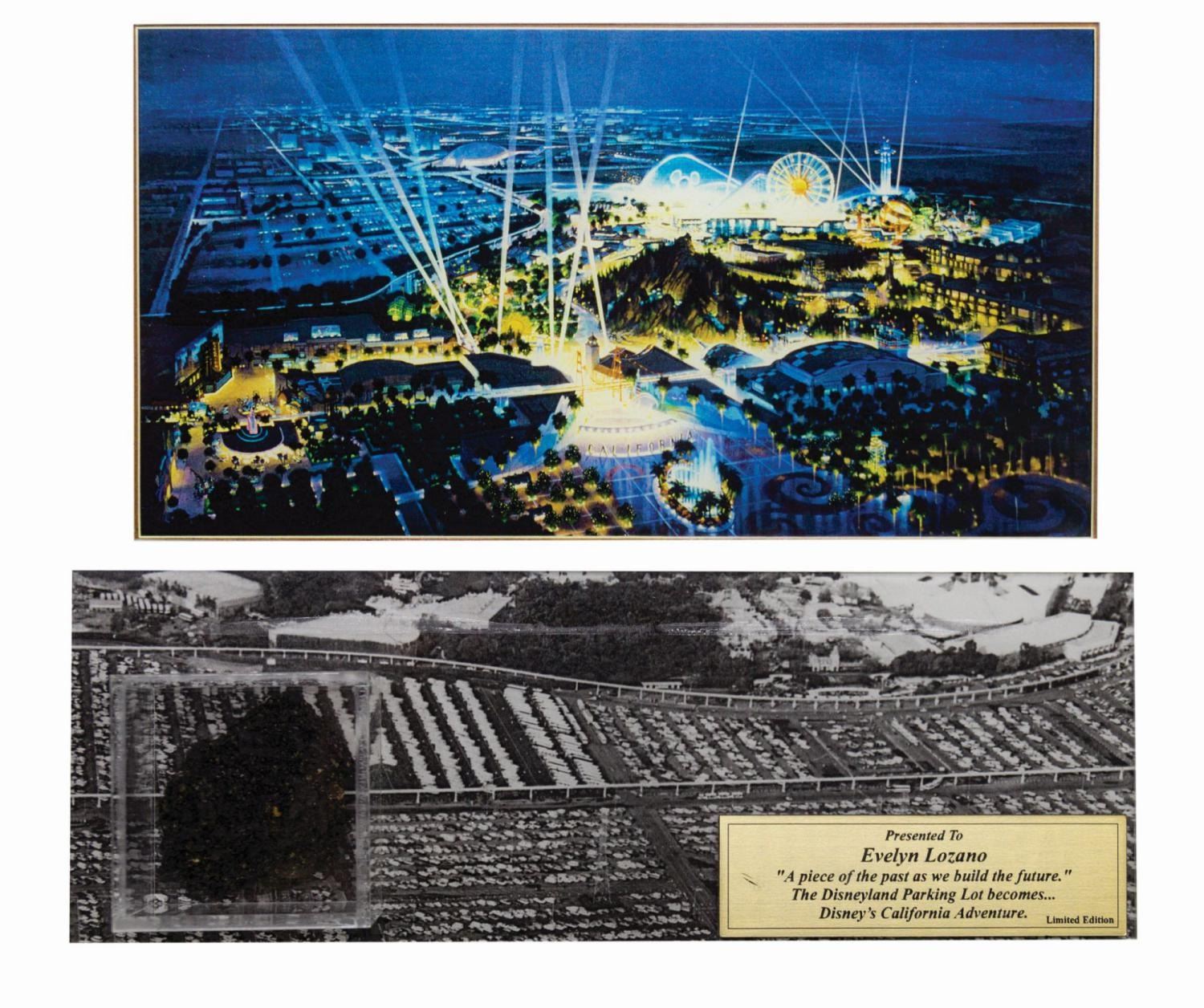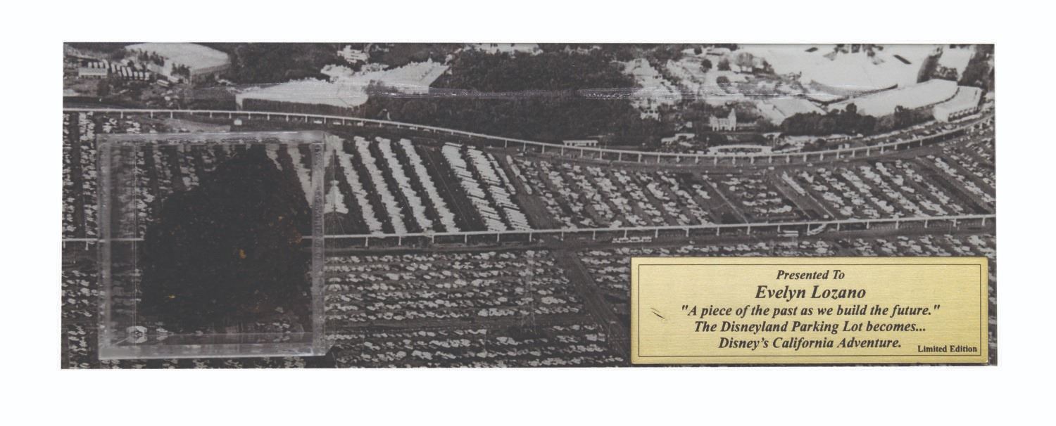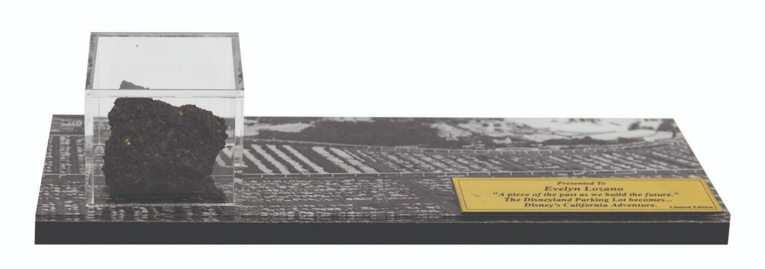 (Disneyland, 1998) A commemorative gift created for Imagineers working on the team that demolished the Disneyland Parking Lot Area to make way for Disney's California Adventure Park. The vintage memento consists of a chunk of charred asphalt from the original Disneyland parking lot, in an acrylic box, on a rectangular acrylic base featuring an aerial black-and-white photo print of the Lot and a plaque engraved to Evelyn Lozano with the quotation "A piece of the past as we build the future." A rectangular acrylic slab is adhered perpendicularly to the base and contains a color print of concept park for the new West Coast Park. Measuring 4.75"x9.25" and 3.25" deep, the piece is in very good condition with minor surface wear. The slab has been reattached.