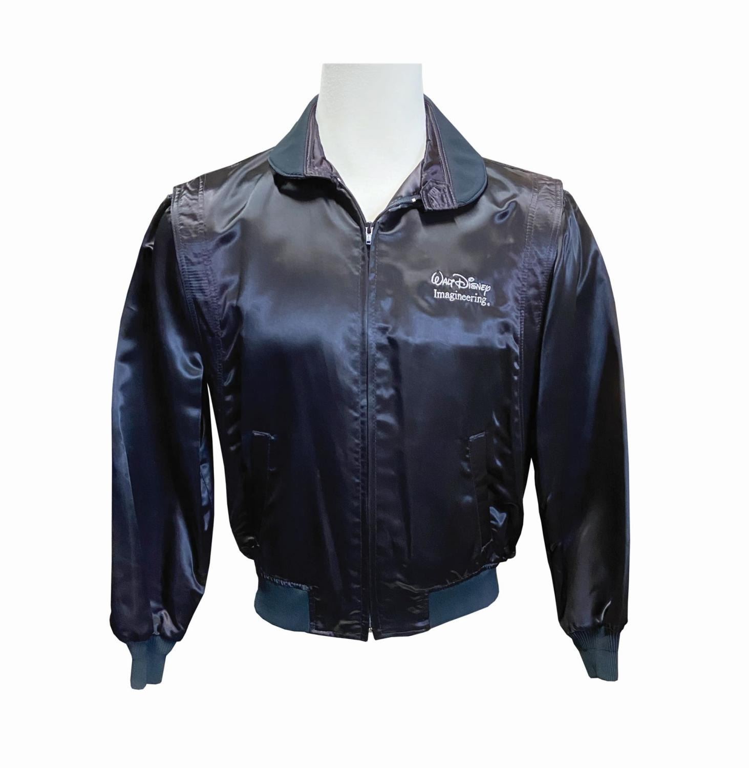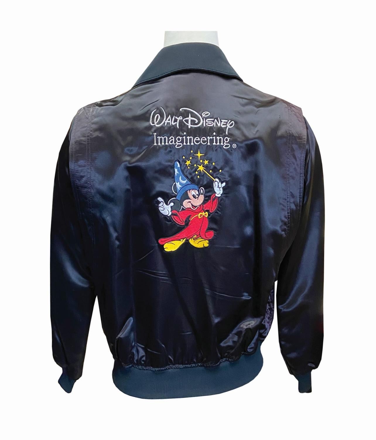 (Disneyland, c.1980s) A jacket created for the staff of Walt Disney Imagineering. Created in 100% acetate, the zippered jacket has an embroidered "Walt Disney Imagineering" on the left breast, and a large embroidered image of Sorcerer Mickey on the reverse with the same text. Marked as a size x-large, the jacket is in very good condition with minor wear.