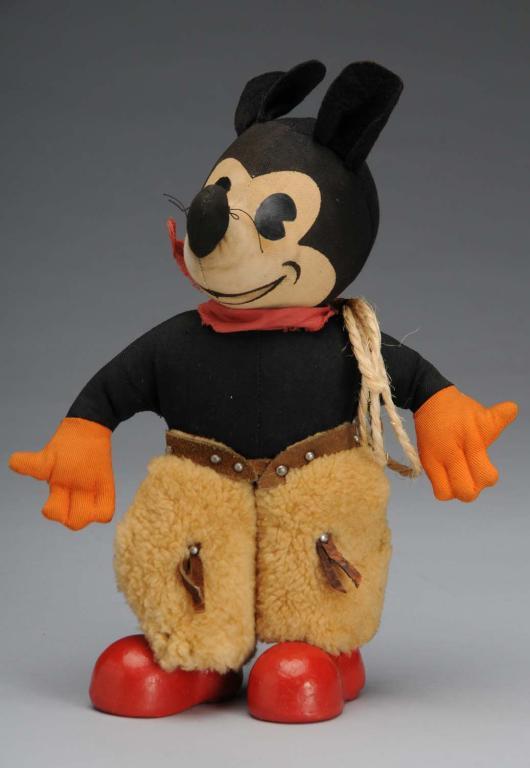 Doll is dressed in fur-covered chaps with composition shoes. Mickey has neckerchief on. Includes one gun and piece of rope, but does not look original. Some soiling to face. Condition (Very Good - Excellent).