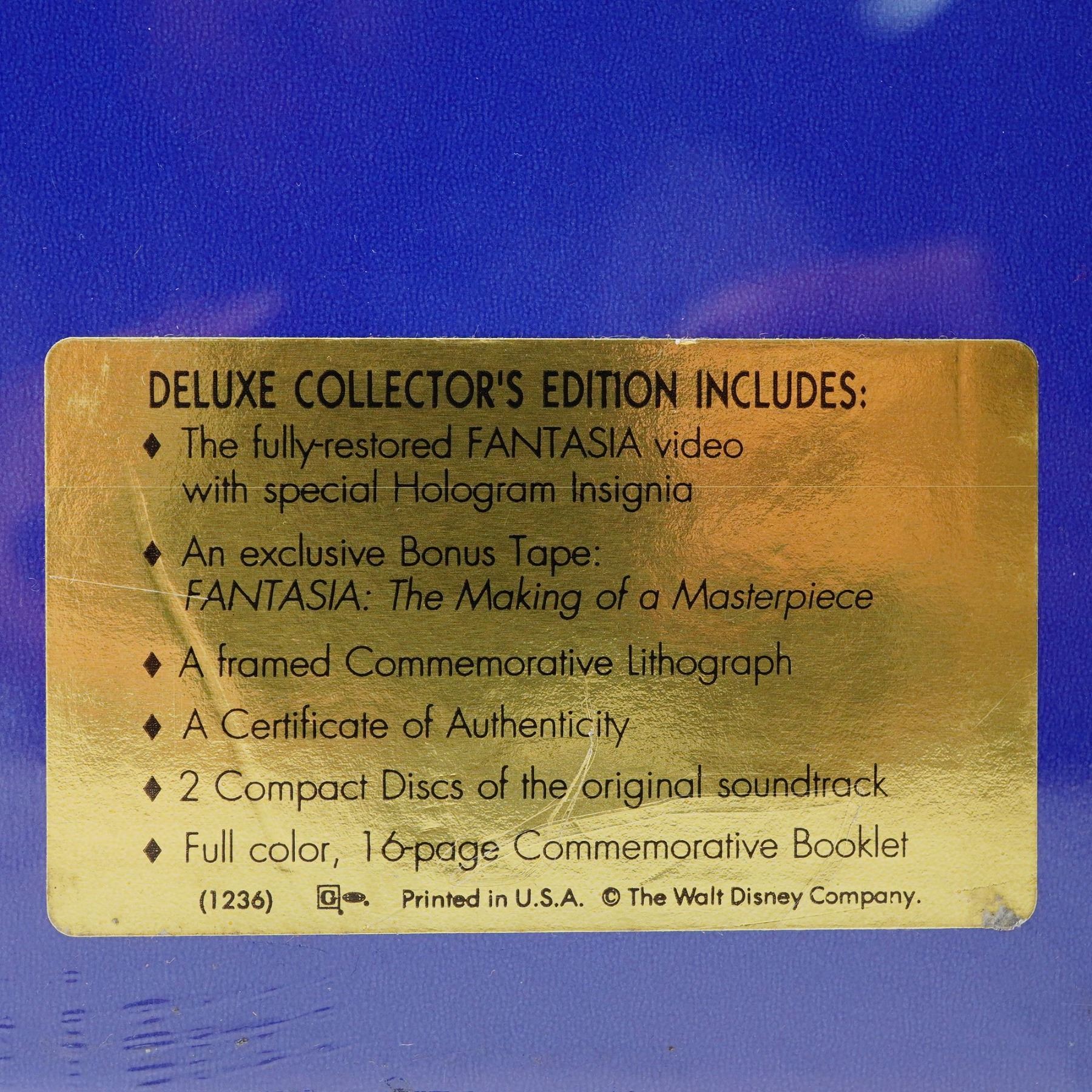 Deluxe collector's edition VHS box set containing the fully restored version of Fantasia with hologram insignia. Includes an exclusive bonus tape titled Fantasia: The Making of a Masterpiece, a framed commemorative lithograph, certificate of authenticity, two compact discs of the original soundtrack, and a full-color 16-page commemorative booklet.