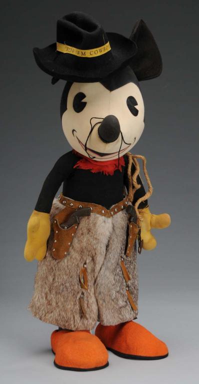 Unmarked but has "Knickerbocker Mickey Mouse" tag on left arm at wrist. Mickey is dressed as a cowboy with fur chaps, leather holsters, hat that says "Ride 'em Cowboy" and two small iron guns. Retains four whiskers and pie eyes. Slight sewing to face with chaps, gun and hat possibly not being original to doll. Condition (Very Good - Excellent). Size 22" T.