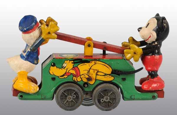 Description England. Pre-war. Made by Wells. Working. Toy is tin and figures are composition. Some chipping to both figures with moderate wear overall. Condition (Very Good). Size 7" L.