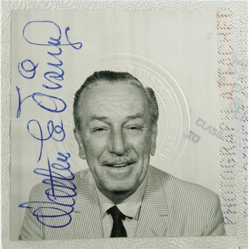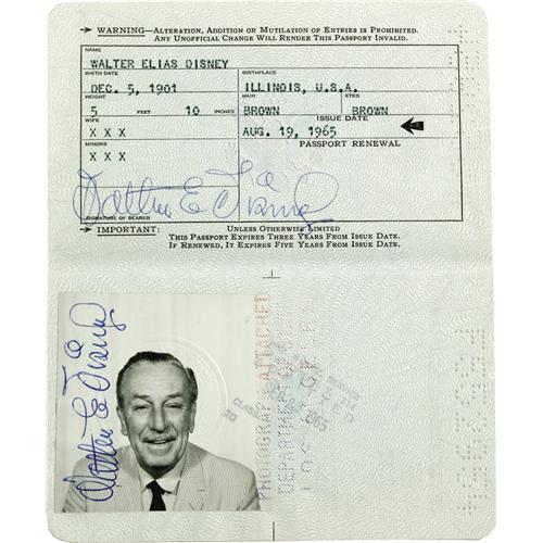 <B>Walt Disney Passport.</B></I> Disney autographs are rare and hugely desirable, and this one comes in truly amazing form. This United States passport is dated August 19, 1965, and was issued to the legendary animator shortly after the giant success of <I>Mary Poppins</B></I> (1964) and 16 months before his death (December 15, 1966). Disney signed the passport twice in blue ink (as "Walter E. Disney"), including once along the edge of his smiling photo. It bears only one set of visa stamps, for a trip to and from London. Following Walt's death, Roy O. Disney, completing his brother's ambitious theme park in Orlando, insisted that the name become Walt Disney World -- a worthy tribute. Perhaps no other show business figure gave so much joy to so many people -- hence Disney's enormous popularity with autograph collectors -- and this passport, with two ultra-rare signatures, accompanying photo and visa stamps, provides one of the most desirable Walt Disney artifacts Heritage has ever offered. In Excellent condition with only very minor wear.<I>Accompanied by LOA from PSA/DNA.</B></I><BR><BR><b>Shipping:</b> Flat Material, Large (<a target="_blank" href="http://www.heritageauctions.com/common/shipping.php">view shipping information</a>) <BR><BR><B>Important