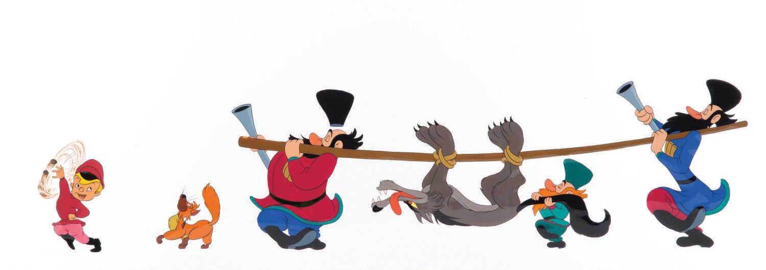 (Disney, 1960) A stunning original production cel featuring the characters from the "Peter and the Wolf" segment of Make Mine Music. The cel is from the Walt Disney Presents TV show titled "This Is Your Life Donald Duck" which premiered on March 11th, 1960. With an image size of 27.5"x7" on a 32.5"x12.5" cel, the piece is in very fine condition.