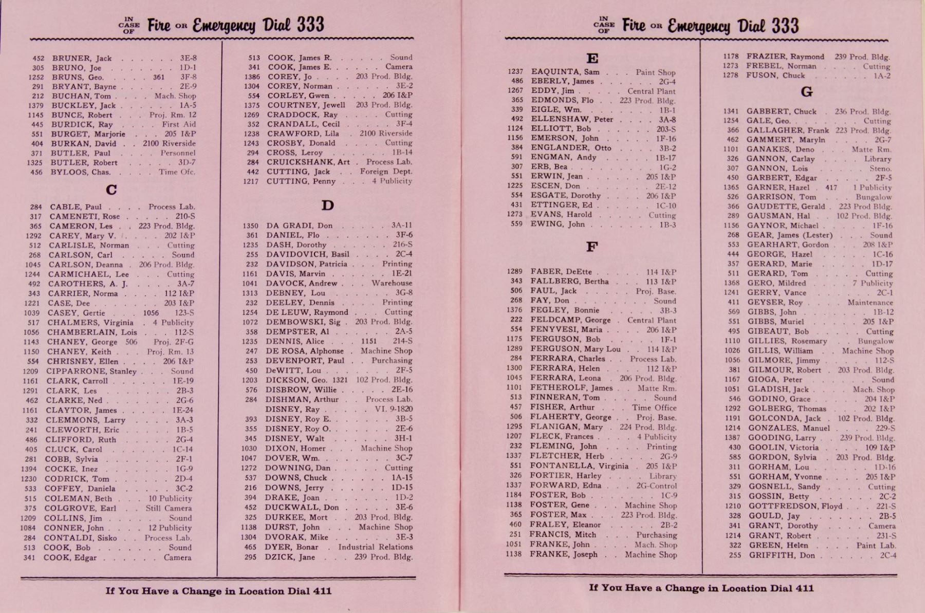 (Disneyland, 1964) A very rare telephone directory for both Walt Disney Productions and Disneyland. This 16-page directory lists the employees of the company and their departments, and includes contact information for notable Disney employees such as Ward Kimball and Roger Broggie, as well as Walt Disney himself. This directory measures 11"x8.25" and is in very good condition with some yellowing around the border from age.