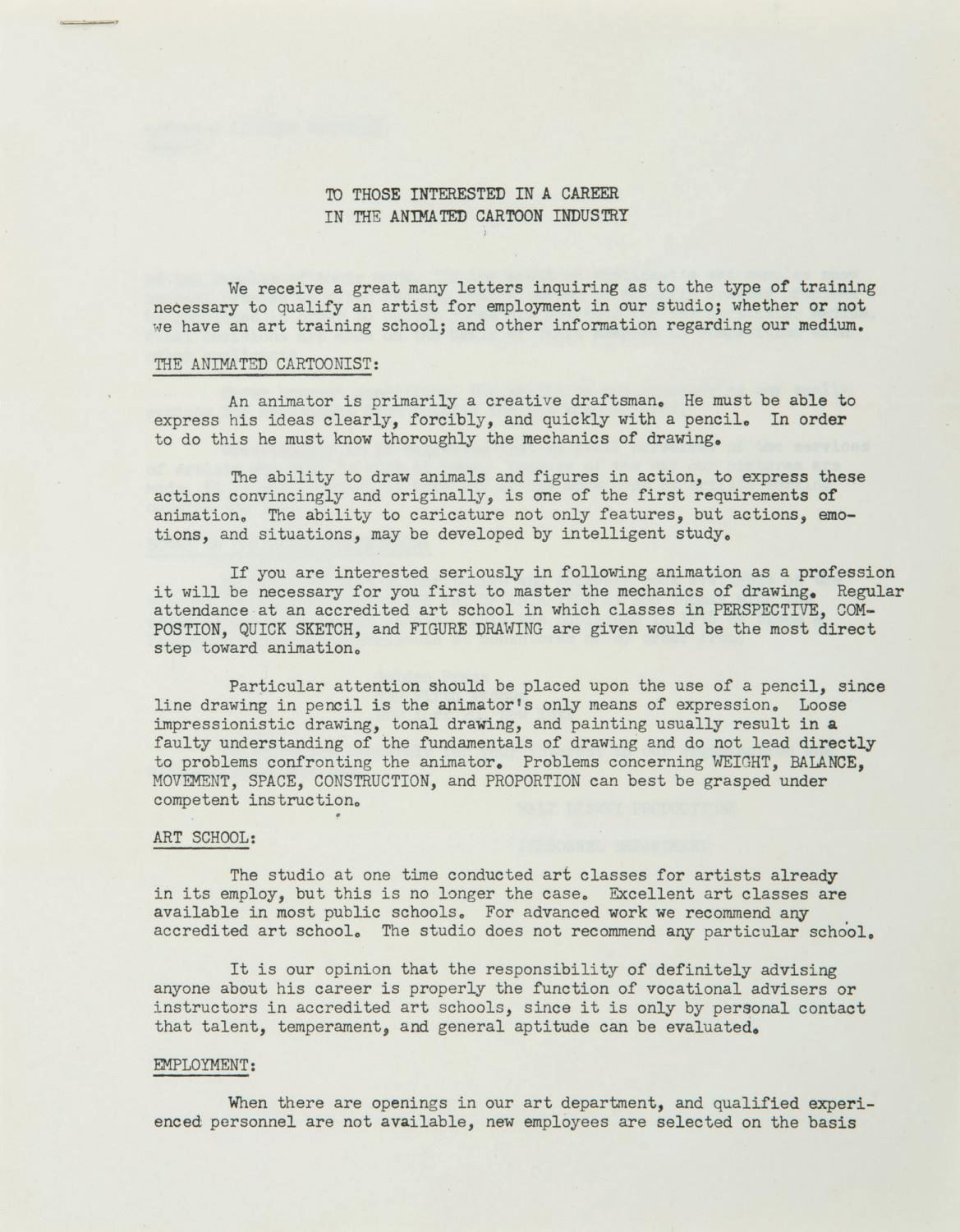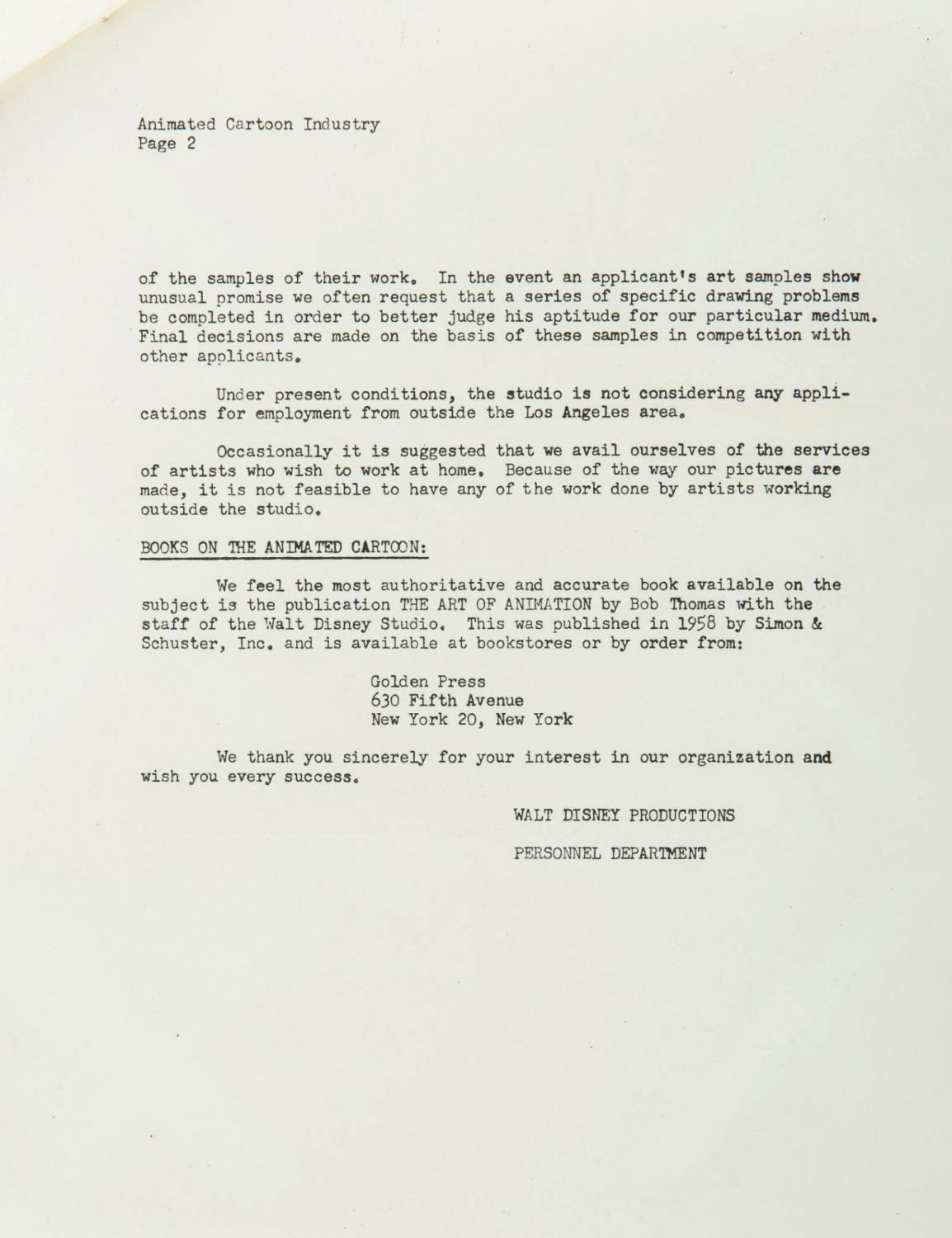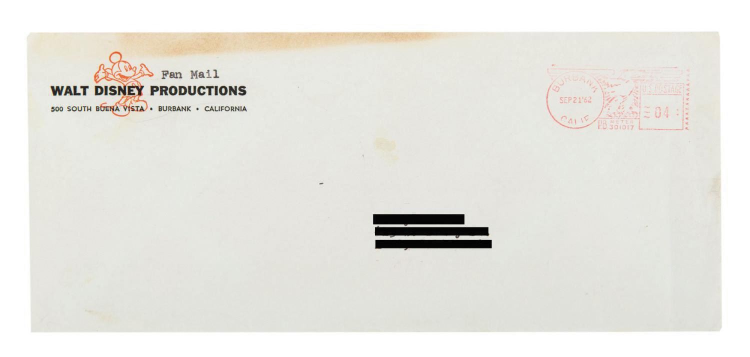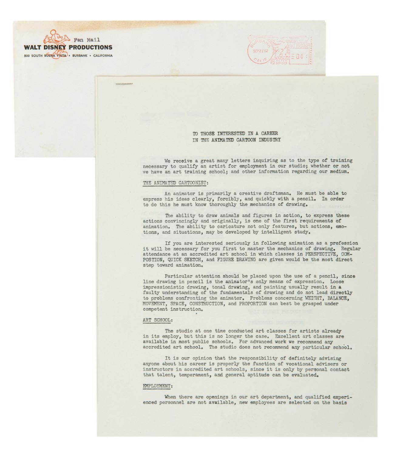 (Disney, 1962) A letter prepared by Walt Disney Productions describing the employment prerequisites to be one of their "animated cartoonists." The letter describes the benefit of art school, how new artists are selected, and ends with the recommendation of an instructional publication, "The Art of Animation" by Bob Thomas. Letter formats of this sort were prepared to address any common inquiries accompanying the waves of mail sent to the Studio. Measuring 11"x8.5", the two-page stapled letter and original envelope are both in very good condition, retaining original folds, and exhibiting a few creases and minor edge wear.