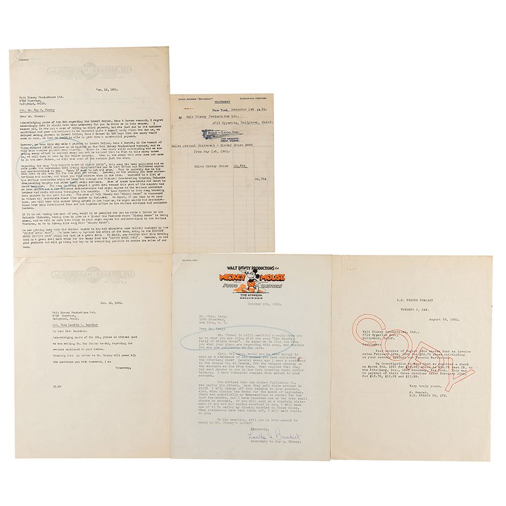 Letter and document group lot related to the publication of the song ‘The Wedding Party of Mickey Mouse’ and a Disney book entitled ‘Mickey Mouse Book,’ which is highlighted by a TLS from Lucille A. Benedict, the secretary to Roy O. Disney, dated October 6, 1931, typed on illustrated Walt Disney Productions, Ltd. Mickey Mouse Sounds Cartoons letterhead, in part: “Mr. Disney is still awaiting a reply from you as to what you are doing with the song ‘The Wedding Party of Mickey Mouse’…Also, Mr. Lang, would you be kind enough to send me a statement of all monies you have collected on the Bibo-Kang book? Several weeks ago I sent a statement to the Kresge Co. at Canada, for the balance showing on the accounts as due from them. They replied that they had sent checks to you in New York covering their entire balance. I have therefore charged this amount to your account.” Included with this letter is the referenced “statement” sent to Benedict from Bibo-Lang, Inc., December 1, 1931, affirming a total sales of $24,994 for the “Mickey Mouse Book,” and a copy of the referenced reply from the S.S. Kresge Company on August 28, 1931. Also included with the lot is an apologetic two-page typed letter from the music publishing company Lee, Bernard, & Madison, Inc., dated October 15, 1931, addressed to Roy Disney and explaining the cause for late payments and confirming that the song ‘The Wedding Party of Mickey Mouse’ has been published. In overall fine condition.