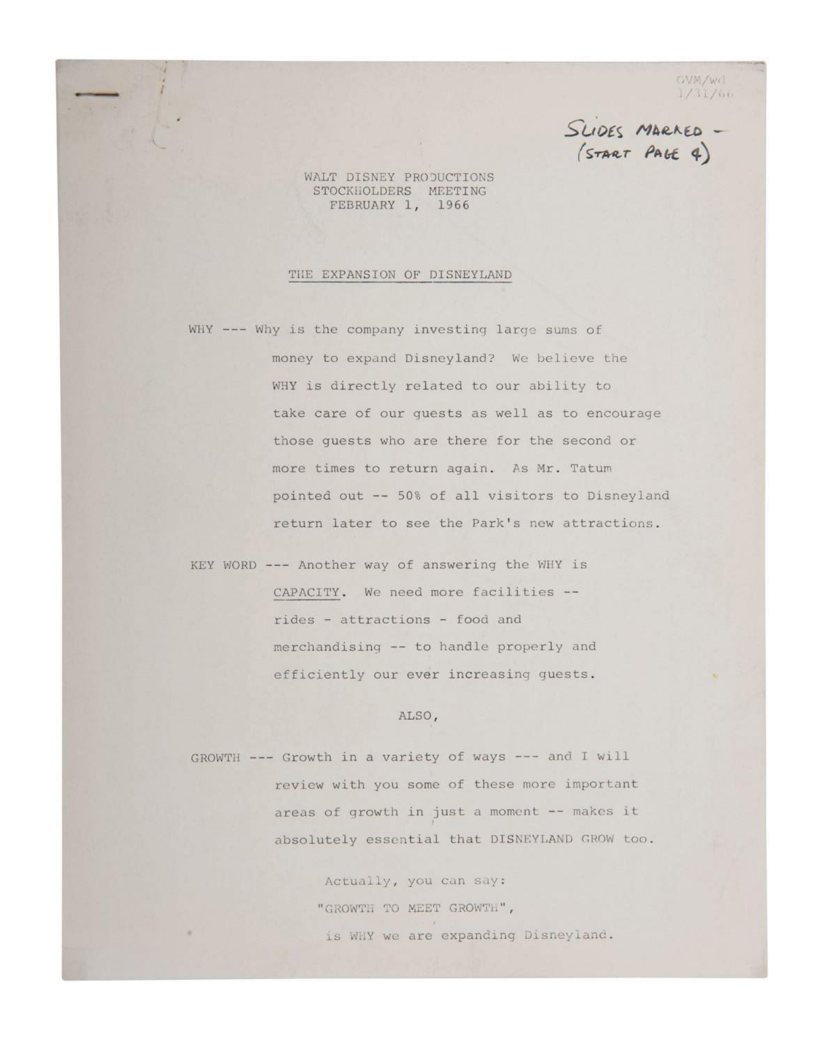 (Disney, 1966) A transcript prepared for the Walt Disney Productions stockholders meeting held February 1, 1966. The 8-page document was created one month prior and covers the growth and attendance at Disneyland, economics research and projections, and the impact on surrounding Orange County attractions including the Disneyland Hotel, Anaheim Sports Stadium, and Anaheim Convention Center. The margins feature some minor annotation for the direction of slide imagery. Measuring 8.5"x11", the documents are in very good condition with minor wear and scuffs to the page surfaces.