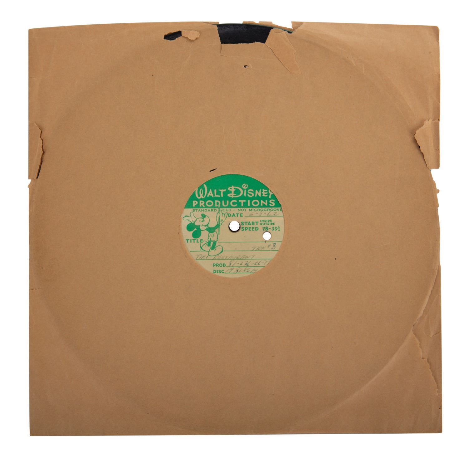 (Disney, c.1962) A Walt Disney Productions Tiki Room acetate recording dated 1962. The acetate contains the orchestral soundtrack (no vocals) for the show. Measuring 12" the 33 1/3 rpm record is heavily scratched, but tracks are still audible.