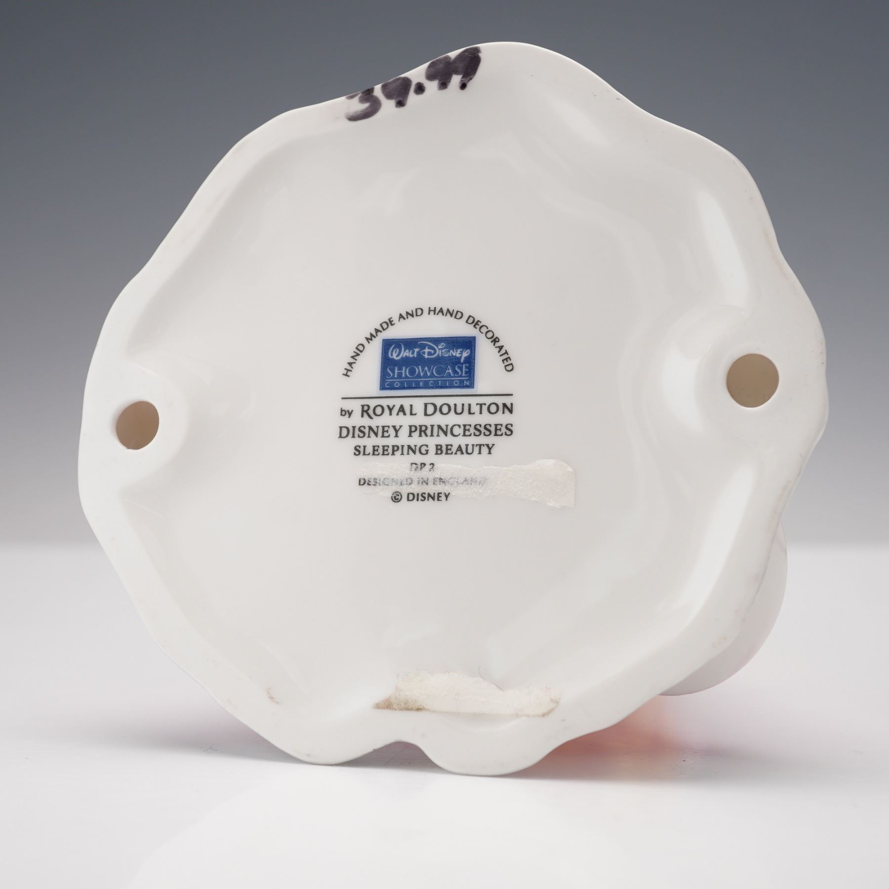 Handmade and hand-decorated fine bone china figurine from the Walt Disney Showcase Collection by Royal Doulton, depicting Sleeping Beauty in a pink gown with flowing blonde hair and hands clasped gracefully. She stands on a floral base adorned with pastel blossoms. Marked to base Walt Disney Showcase Collection, Royal Doulton, Disney Princesses, Sleeping Beauty DP2, Designed in England. Royal Doulton backstamp.