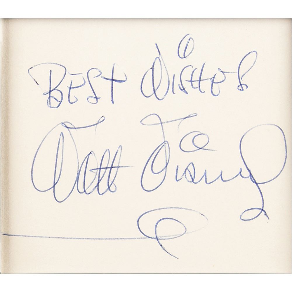 Magnificent vintage ballpoint signature, "Best wishes, Walt Disney,” on an off-white 5.25 x 4.25 album page, archivally double-matted and framed with a portrait to an overall size of 14.5 x 22.5. In fine condition. A choice, large example of Walt Disney's sought-after autograph.