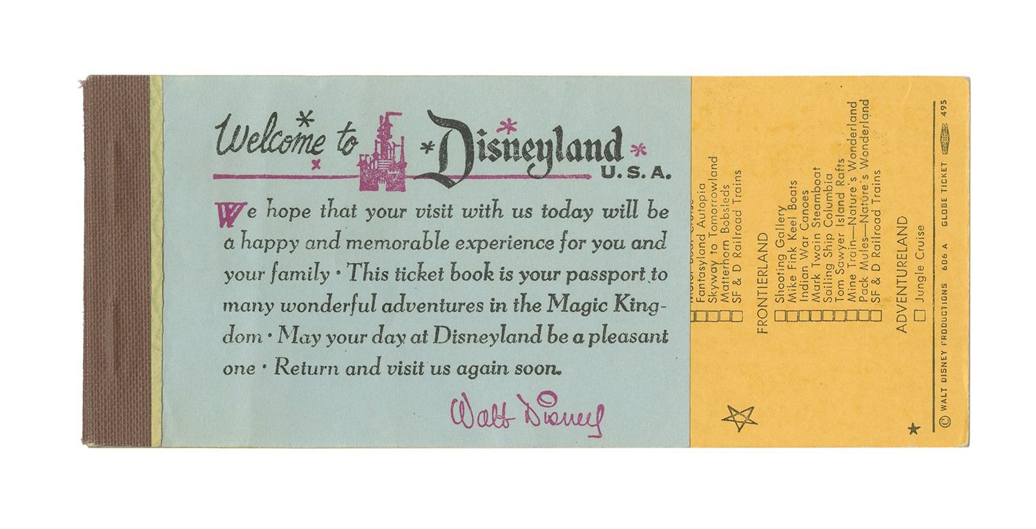 (Disneyland, c.1960) An original park-used ticket book that is signed by Walt Disney on the back cover. Walt was known to walk around his park, and excited guests who saw him would often ask for his autograph on whatever they had handy, which was often their ticket books. This guest appears to have been so excited to see Walt that they handed their ticket book over to him upside down. The ticket book is signed in ink on the reverse. Measuring 2.5"x6", the ticket book is in very good condition with some edge-wear. All the tickets have been used. A Certificate of Authenticity from noted Walt Disney signature expert Phil Sears is included.