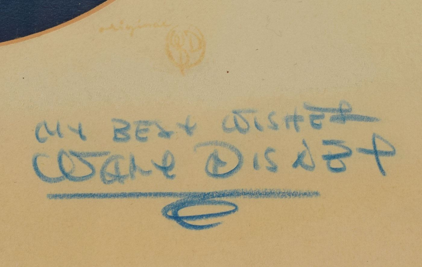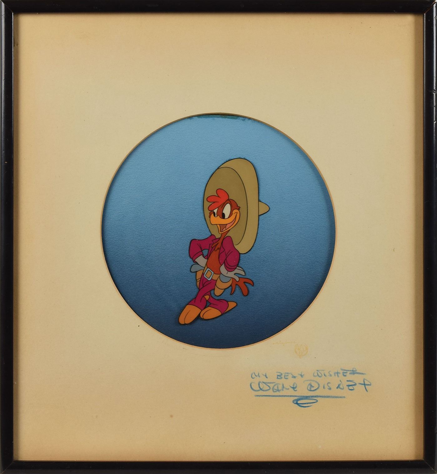 (Walt Disney Studios, 1944) Fantastic original production cel featuring Panchito Pistoles from the live-action animated musical The Three Caballeros, neatly signed on the mat in blue artist's crayon, "My best wishes, Walt Disney." The cel has been trimmed to image and applied to an airbrushed background, and displayed in its original mat prepared by the Art Props Department at Disney Studios. Character image measures 2.5 x 4.75 with a mat opening of 6.5 x 6.5. Below the opening is a light calligraphic caption, "Panchito," and an "Original WDP" stamp. Framed to an overall size of 12 x 13. In fine condition, with very subtle evidence of a professionally removed inscription above Disney's signature. A brilliant production cel boasting an ideal example of Disney's autograph.