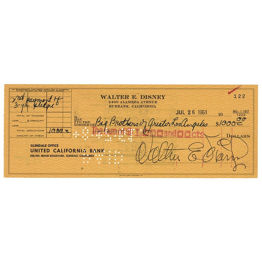 Personal check, 8.25 x 3, filled out in another hand and signed prominently by Disney, "Walter E. Disney," payable to Big Brothers of Greater Los Angeles for $1000, July 26, 1961. In fine condition. Walt Disney and composer Meredith Willson founded Big Brothers of Greater Los Angeles in 1955 to help ensure the well being of boys growing up without fathers in Los Angeles. Accompanied by a certificate of authenticity from Phil Sears Collectibles.