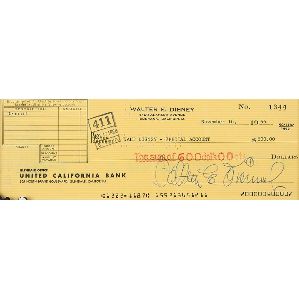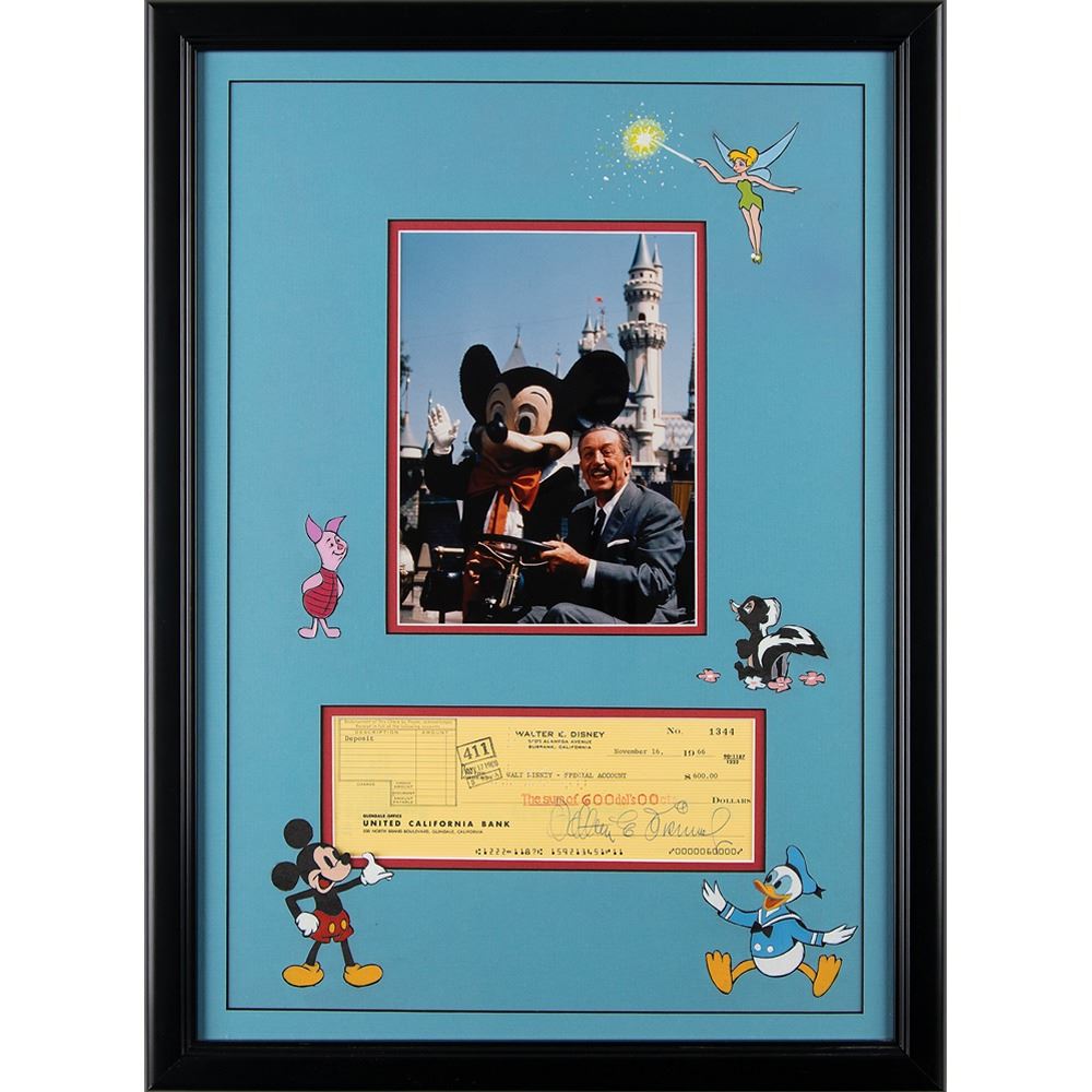 Significant personal check, 8.5 x 2.75, filled out in type and signed by Disney, "Walter E. Disney," payable to Walt Disney—Special Account for $600, November 16, 1966. Impressively double-matted and framed with a portrait and portrayals of several iconic Disney characters to an overall size of 16 x 22. In fine condition. Accompanied by a certificate of authenticity from Phil Sears Collectibles and a detailed 2010 letter discussing the history of the check, in part: "The check is notable in that one month after the check was signed Walt Disney passed away. This makes the check one of the last to be signed by Walt Disney; as of this writing I have not seen one of a later date. On November 7, 1966, Walt Disney entered Saint Joseph Hospital—across the street from the Disney Studio—and a cancerous lung was removed. He remained in the hospital two weeks, being released on November 21. During his hospitalization Walt's secretary Tommie Wilck shuttled back and forth from the studio with the most important paperwork. This is how the check came to be signed while Walt Disney was in the hospital. Just over a week after being released, Walt's condition deteriorated and he was re-admitted to the hospital on November 30th. He never recovered, and passed away at the hospital on December 15th."