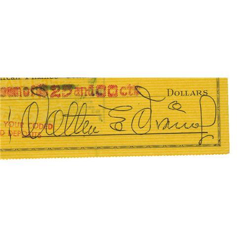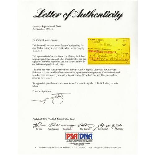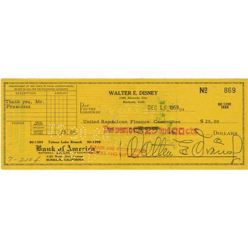 <B>Walt Disney Signed Check.</B></I> A personal check for the sum of $25, dated December 16, 1959 and signed "Walter E. Disney" in black ink, with "Thank you, Mr. President" typed in the memo space in the upper left corner. In Very Fine to Excellent condition with a fold crease and the usual bank cancellation holes and marks. <I>Accompanied by LOA from PSA/DNA.</B></I><BR><BR><b>Shipping:</b> Flat Material, Small (<a target="_blank" href="http://www.heritageauctions.com/common/shipping.php">view shipping information</a>) <BR><BR><B>Important not