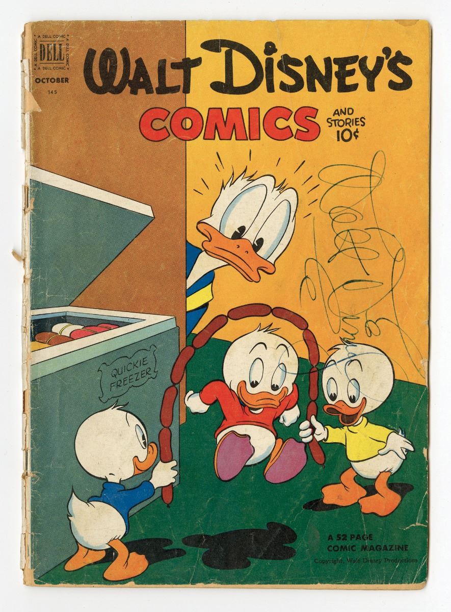 (Dell Comics, 1952) "Walt Disney’s Comics and Stories" hand-signed by Walt Disney in ballpoint pen. The comic is in good condition with wear and edge tears on cover.