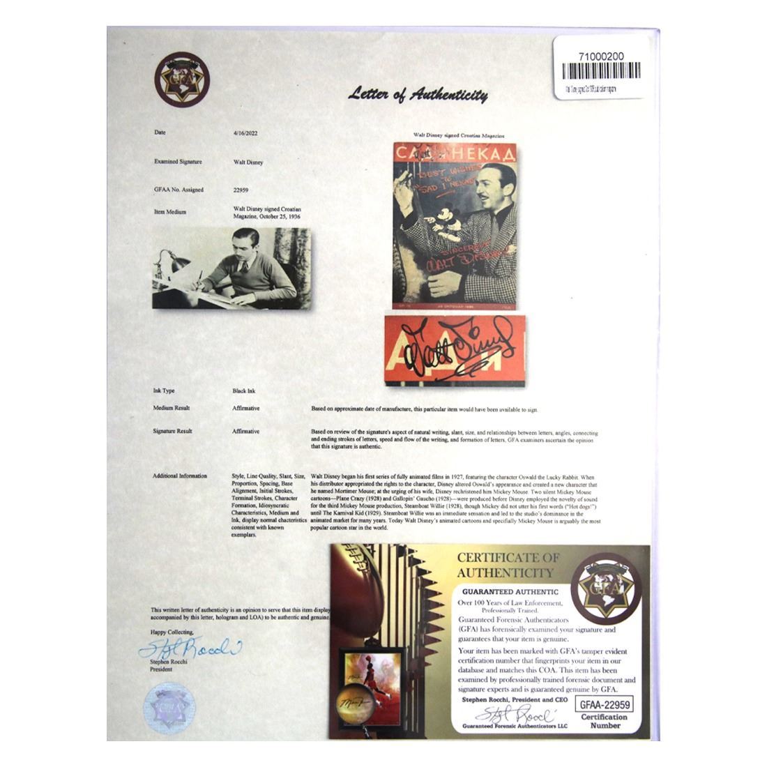 Walt Disney (1901-1966) signed Magazine from October 25, 1936. Boldly signed in black ink on the cover of the magazine. CYRILLIC EXYUGO MAGAZINE PHILIPS entertainment magazine from Kingdom Of Jugoslavia: SAD I NEKAD ( Now and Then ), dated from 1936Comes with a Letter of Authentication from Guaranteed Forensic Authenticators (GFA), along with the GFA guarantee of authenticity.