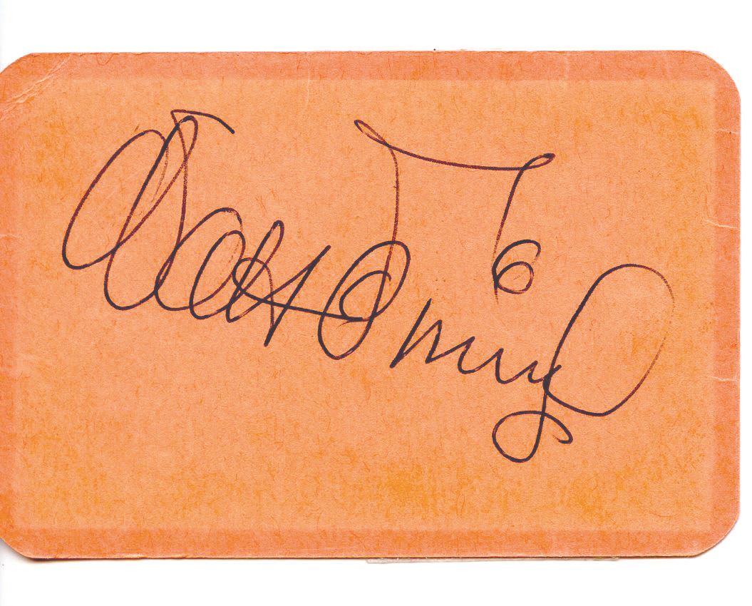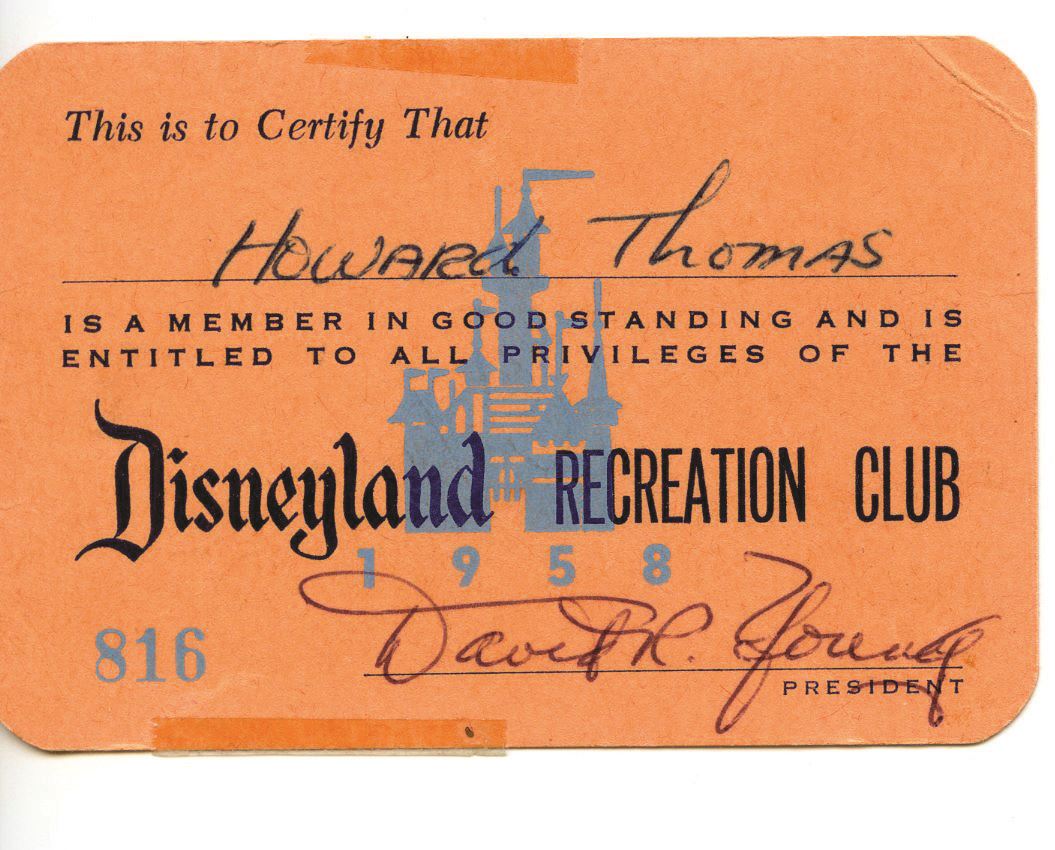 (Disneyland, 1958) On one particular day during the summer of 1958, 21-year old Howard Thomas was working his regular job as ride operator on the Mad Hatter Tea Party ride when he suddenly realized that Walt Disney was standing behind him watching him work. Flustered, as anyone would be, he looked around for something to have Disney sign. Not finding anything, he reached in his wallet and pulled out his employee Disneyland Recreation Club Card, and asked Walt to sign the back. Measures 3.5”x2.25”. The paper card has the Disneyland Recreation Club on the front and a strong Walt Disney signature in ballpoint pen on the reverse. In good condition with wear and creases from age and use. An amazing piece of Disneyland memorabilia.