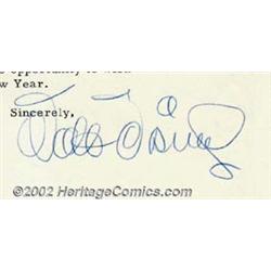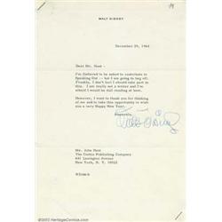 Walt Disney Signed Letter (1964). A cartoonist, motion picture producer, and businessman, Walt Disney was a legend in the entertainment industry whose accomplishments are too numerous to list in this description. Offered here is a typed letter on his personal letterhead, boldly signed "Walt Disney." Dated December 29, 1964, it was written to John Hurt of the Curtis Publishing Company. The letter is in pristine condition, still exhibiting exceptional whiteness. The piece was folded in thirds for mailing, and has staples at the upper left and lower right corners. There are also mounting remnants on the reverse, meaning this piece was most likely framed at some point. A bold, wonderful signature. This would be a superb piece for the autograph hunter or Disney collector. A letter of authenticity from University Archives is included.  Important notice: We expect to be auctioning lots at the rate of 200-250 per hour. Sometimes eBay Premier live bid software cannot keep up with that pace, so we strongly recommend that you place a realistic proxy bid now as insurance to avoid disappointment. Also please note that all Heritage/CAA lots purchased through eBay Premier carry a 20% Buyer's Premium.