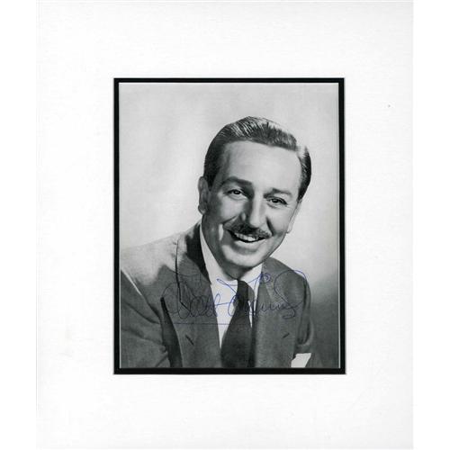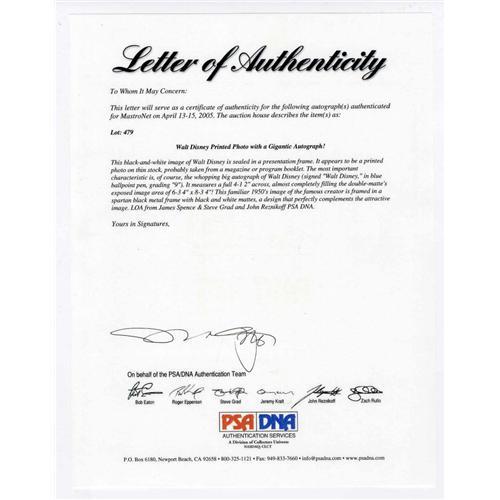 <B>Walt Disney Signed Photo, with COA (undated).</B></I> Uncle Walt himself took pen in hand to boldly sign this black and white printed photo. The picture has been double-matted to an overall size of 12" x 14", and is in Excellent condition. We know not all Disney signatures were actually by Walt (in fact, many were signed by studio artists), so this piece comes with a letter of authenticity from PSA/DNA, and here's some of what they say: "This black-and-white image of Walt Disney is sealed in a presentation frame. It appears to be a printed photo on thin stock, probably taken from a magazine or program booklet. The most important characteristic is, of course, the whopping big autograph of Walt Disney (signed "Walt Disney," in blue ballpoint pen, grading "9"). It measures a full 4.5" across, almost completely filling the double-matte's exposed image area of 6.75" x 8.75"!" Keep in mind that when PSA/DNA (a very <I>conservative</B></I> outfit when it comes to authenticating autographs) gushes on like this, they mean business!<BR><BR><b>Shipping:</b> Flat Material, Small (<a target="_blank" href="http://www.heritageauctions.com/common/shipping.php">view shipping information</a>)