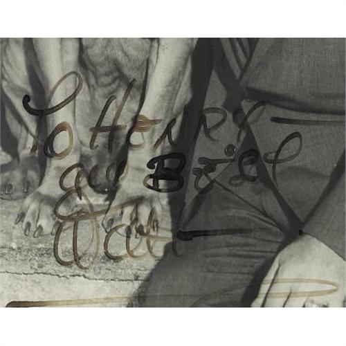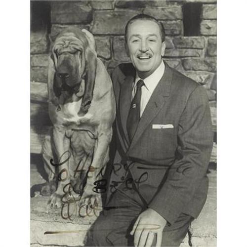 <B>Walt Disney Signed Photo.</B></I> This great b&w 11" 14" photo of animation and family entertainment icon Walt Disney with his pet bloodhound is inscribed "To Henry -- all best, Walt" by Disney in black marker. A great sample of Disney's rare signature, matted and framed to an overall size of 15.5" x 18.5", and in Very Fine to Excellent condition with mild toning and jist a little bit of fading tot he autograph.<BR><BR><b>Shipping:</b> Framed - with Glass, Small (<a target="_blank" href="http://www.heritageauctions.com/common/shipping.php">view shipping information</a>)
