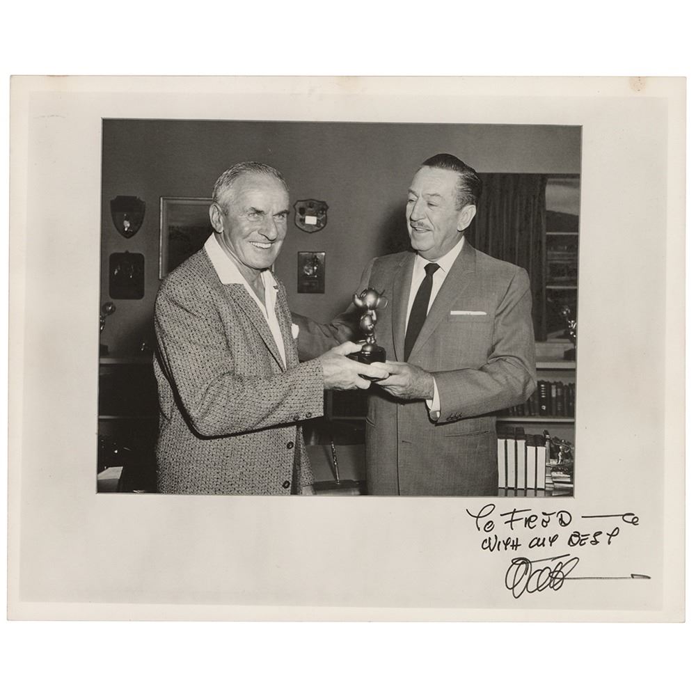 Vintage matte-finish 10 x 8 photo of Disney presenting a Mickey Mouse retirement award to the photo's recipient, Fred Schlatter, the longtime gardener at Walt Disney Studios, signed and inscribed in the lower border in black ink "To Fred‰ÛÓwith all best, Walt.‰Û In very good to fine condition, with some staining to the surface, visible at an angle.