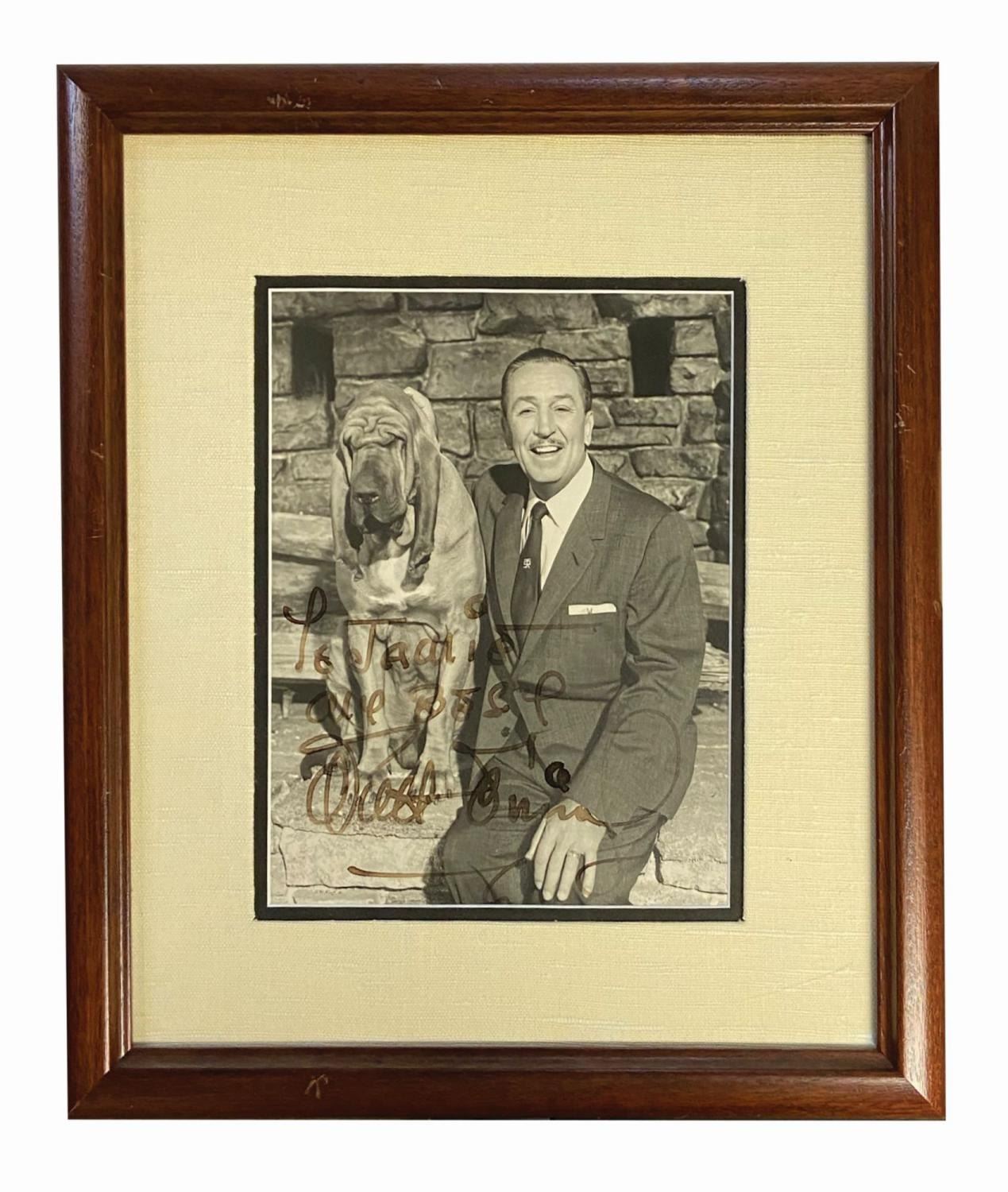(Disney, 1950s) An exceptional vintage gelatin silver presentation portrait photograph on matte textured paper that is signed by Walt Disney. Depicting Walt seated next to a large bloodhound on the edge of a stone fireplace, the photo is signed and inscribed boldly in black ink on the bottom half of the image, "To Jackie, All Best Walt Disney." The piece is accompanied by a Beckett Letter of Authenticity. Measuring 9.25"x7.25" visible through a double mat in a 15.75"x13.75" dark wood frame, the photo appears to be in very good condition with some minor waviness across the top edge. The ink has faded with time, though the inscription and signature remain large and legible.