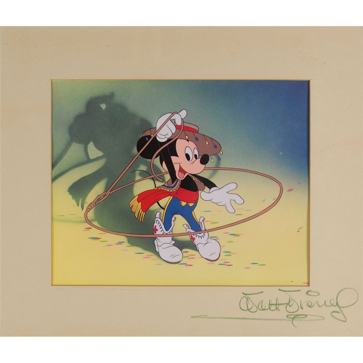 Fabulous off-white 14 x 12 presentation mat prepared by the studio to exhibit an original cel, prominently signed on the mount in bold green artist’s crayon, “Walt Disney.” A light pencil caption, “From Mickey Mouse,” is below the image as issued. Now displayed in the mat is a high-quality dye transfer showing Mickey twirling a lasso around his body. Beginning in the mid 1940s, the Disney Studio created these dye transfers to give away for publicity and to VIPs that visited the studio. It was the best type of cel art reproduction of the time and due to their specialized purpose, production was extremely limited. The presentation as a whole is attractively matted and framed to an overall size of 20.5 x 18.5. In fine condition. An exceptionally appealing, boldly signed, and uninscribed Disney offering.