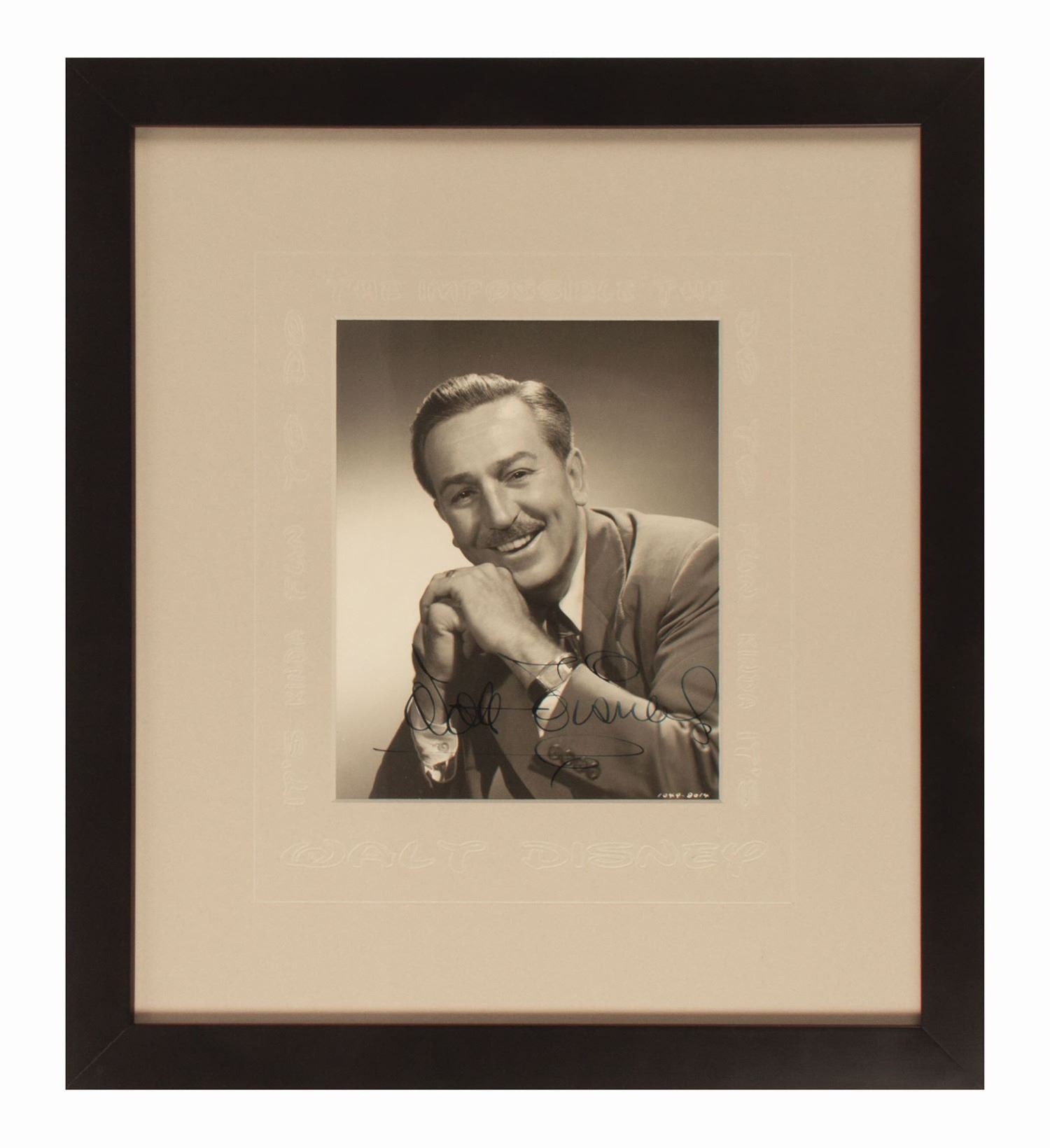 (Disney, c.1950s) An original signed studio publicity portrait photograph of Walt Disney. The gelatin silver double-weight matte photo depicts a seated head-and-shoulders portrait of the animation pioneer and is signed by Walt boldly in black ink across the lower third, "Walt Disney." Measuring 10"x8" overall with 9.25"x7.25" visible through a custom Disney quote mat, the photograph is in a 19.75"x17.5" frame and appears to be in good condition. It exhibits some background creases not affecting the subject, but is unexamined out of frame. The photo is accompanied by a Certificate of Authenticity from noted Walt Disney signature expert Phil Sears.